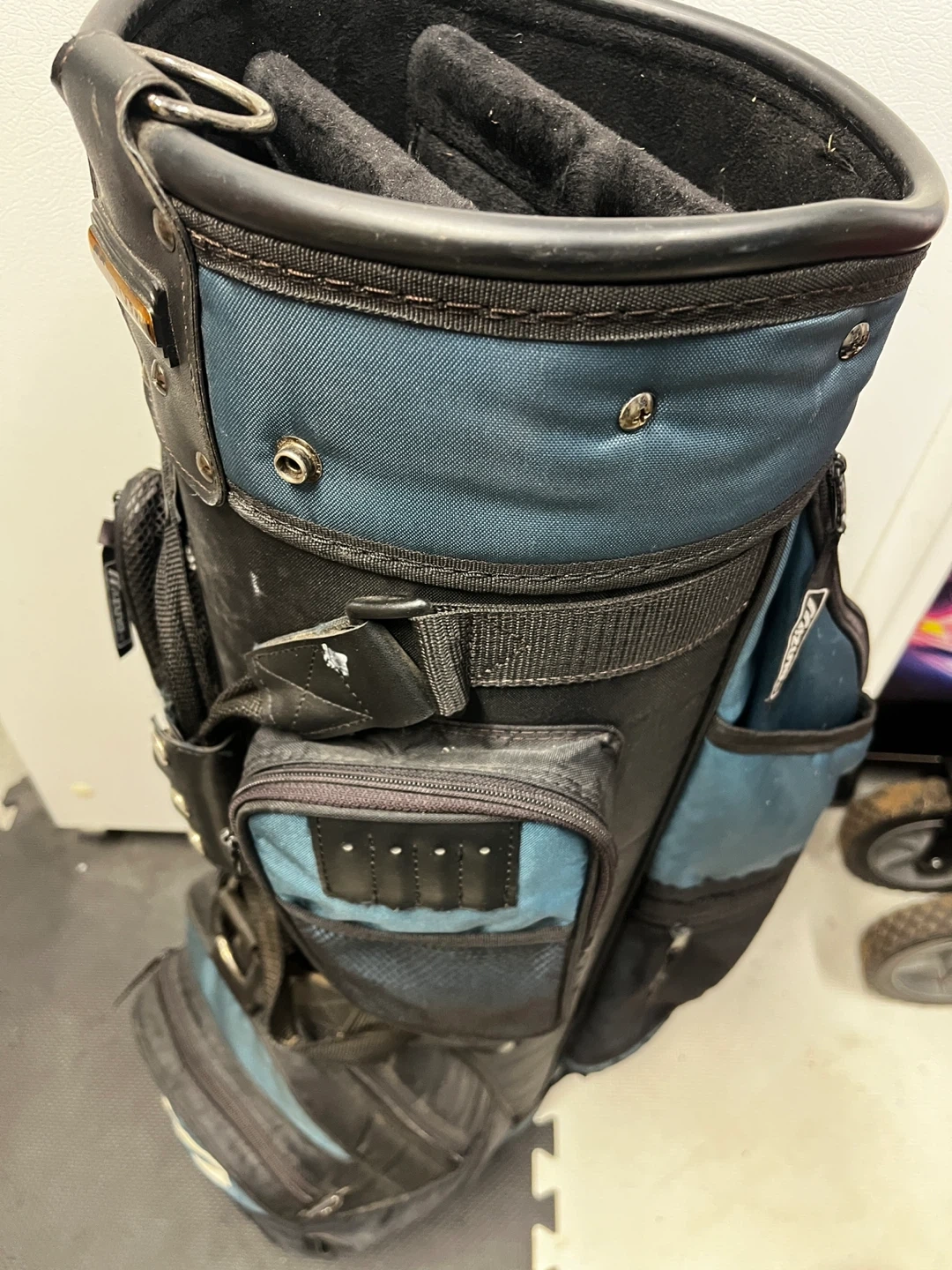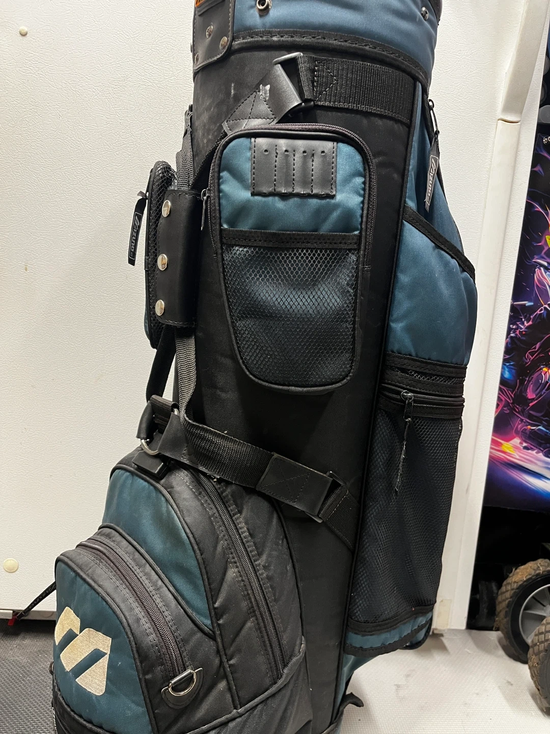 This is a used golf bag. It's black and teal with multiple pockets for storage. It's built for durability and functionality on the course.