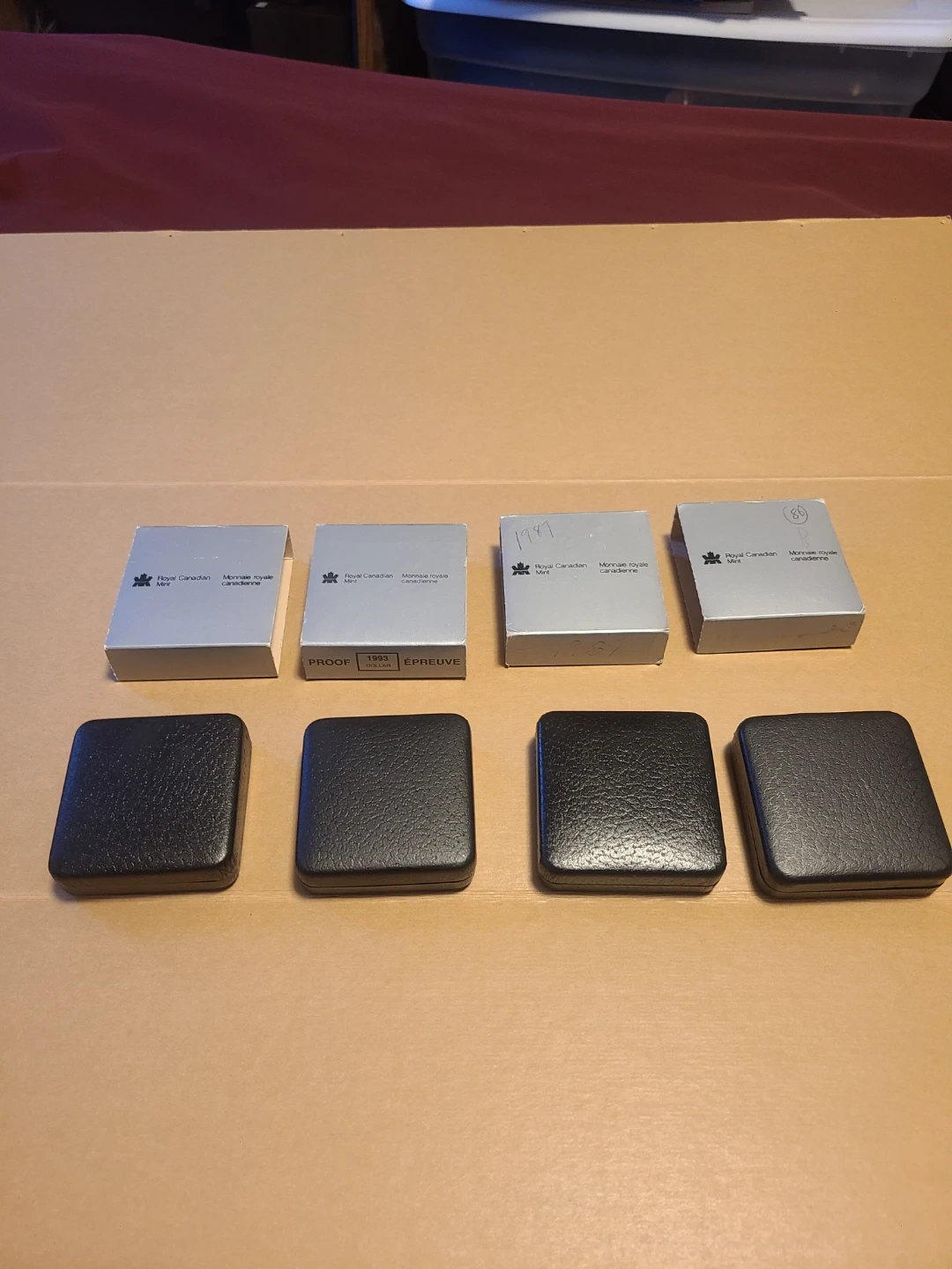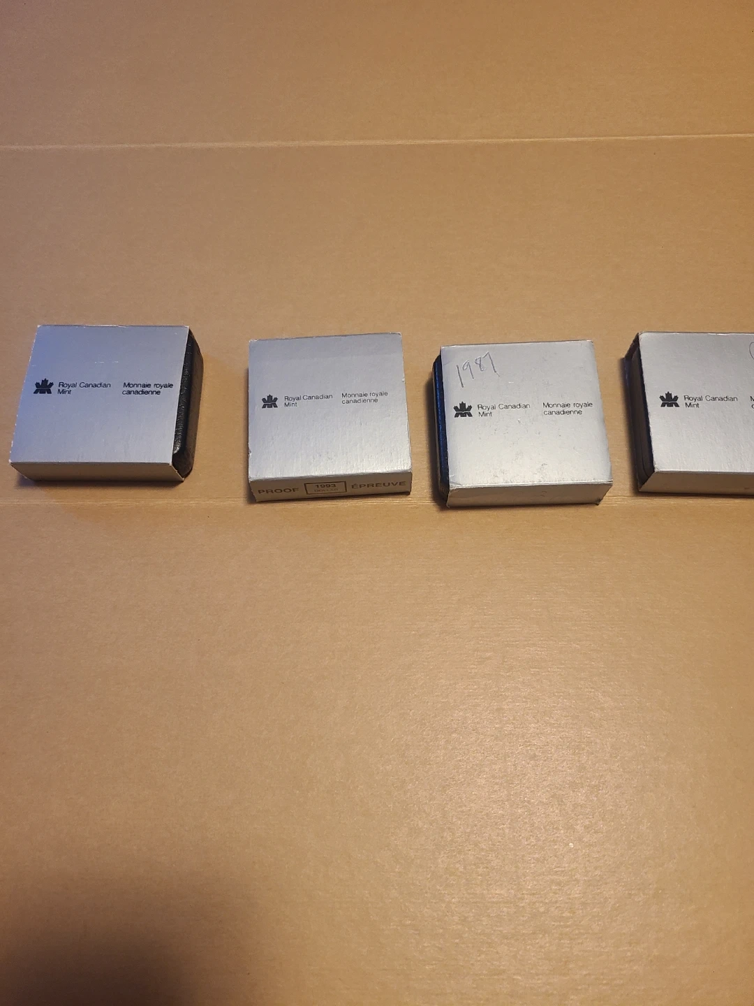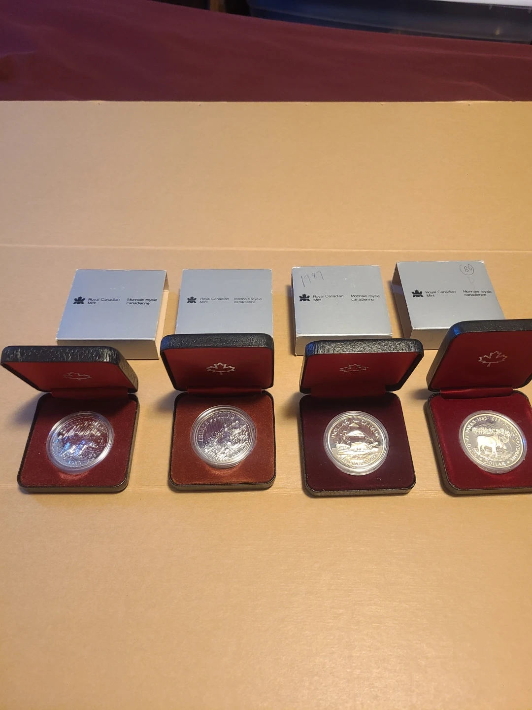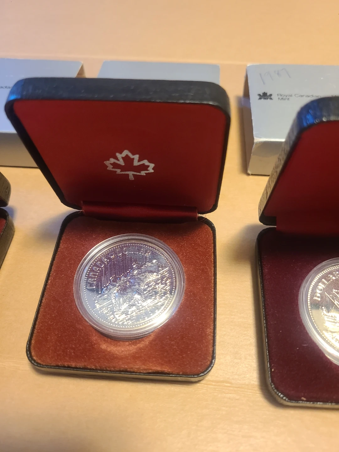 A collection of Royal Canadian Mint proof Silver Dollar coins, presented in their original display. The cases themselves are red velvet lined with a protective sleeve for each coin. The content of silver in each coin is .500. For those who want to pay next to nothing or those who want to know the "lowest" or the "best" price, the answer is $45/each coin.