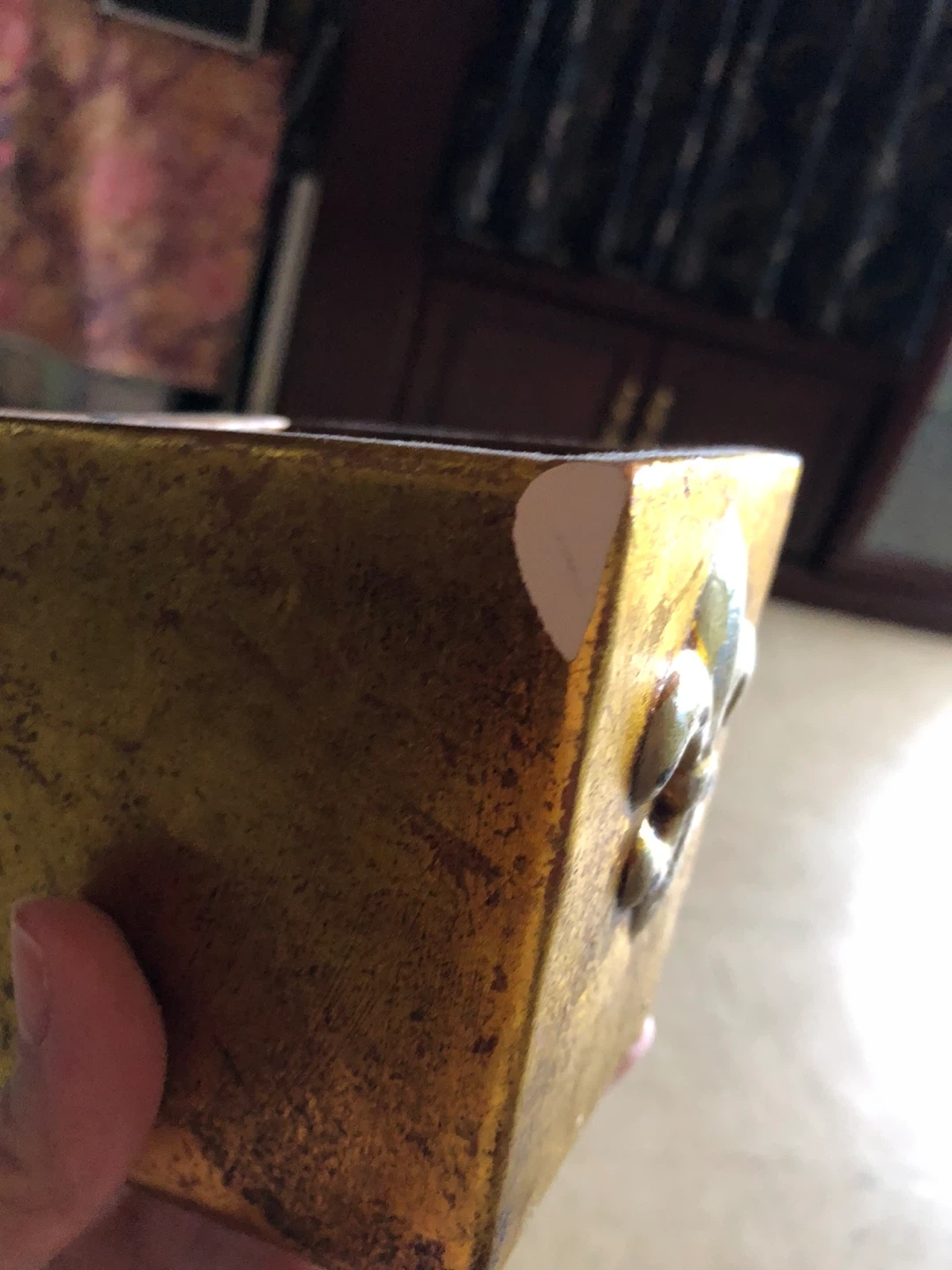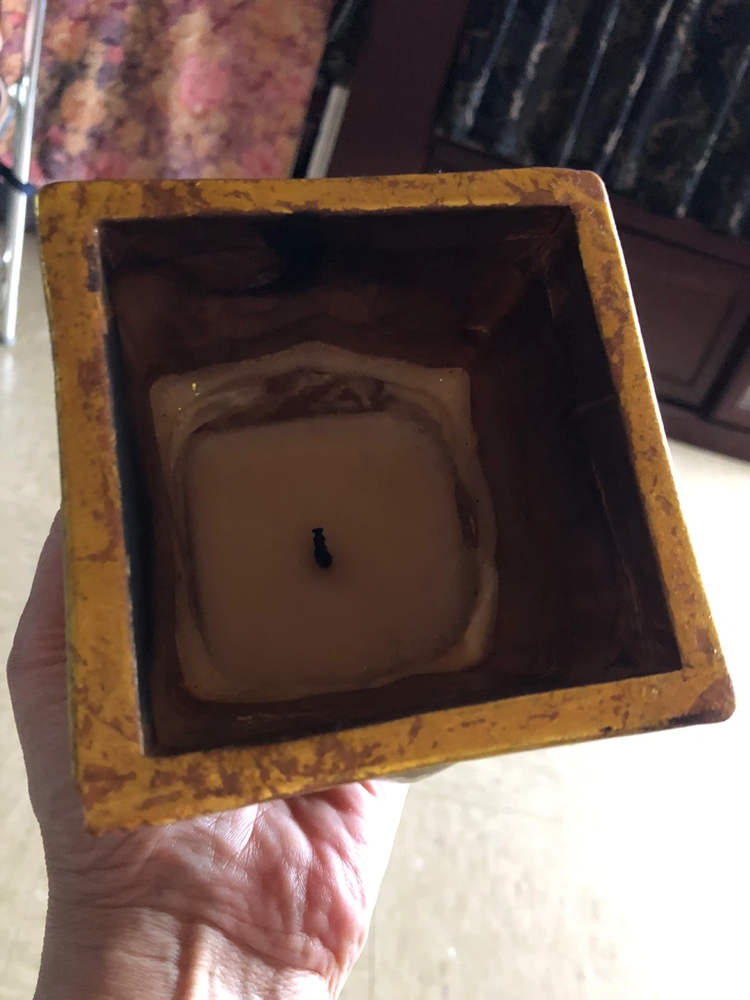 This decorative candle holder features a distressed gold finish and a raised fleur-de-lis emblem on the front. It holds a single pillar candle. Some minor wear is visible on the corners, but it's still a lovely piece for your home decor!