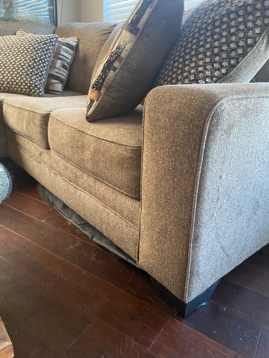Comfortable fabric sectional sofa in a neutral brown tone. It features a chaise lounge for extra relaxation. Includes several throw pillows for added style and comfort. This spacious sofa is great for family gatherings or movie nights.