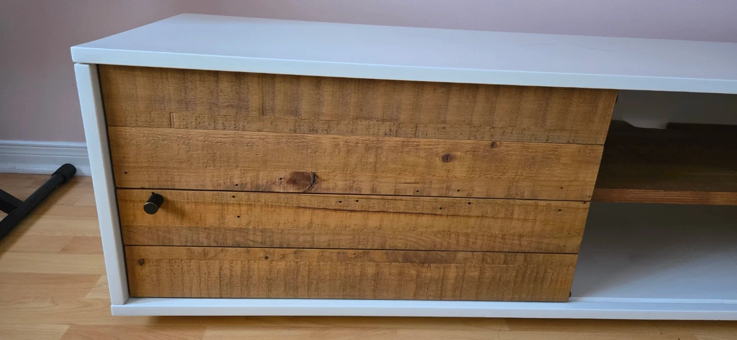 White TV Stand with Rustic Wood Doors