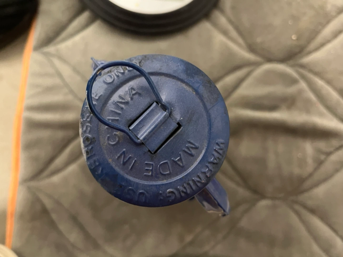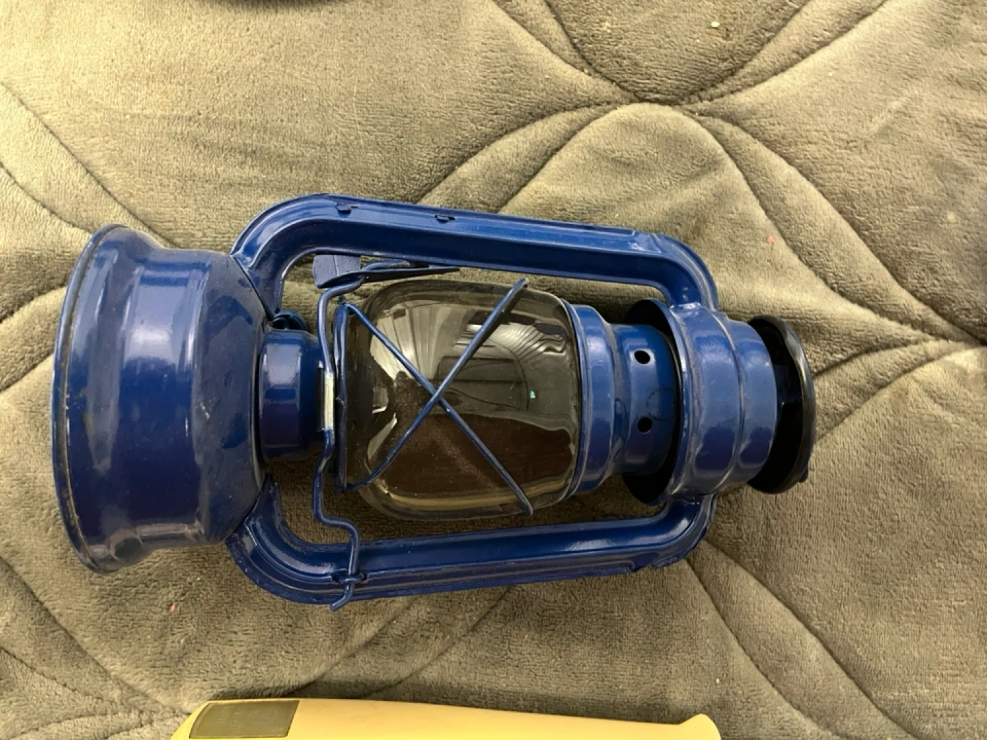 This is a blue oil lantern with a glass globe. It's made of metal and features a sturdy handle for carrying. It's great for outdoor activities or as a decorative piece.