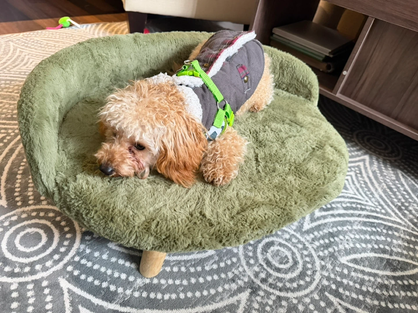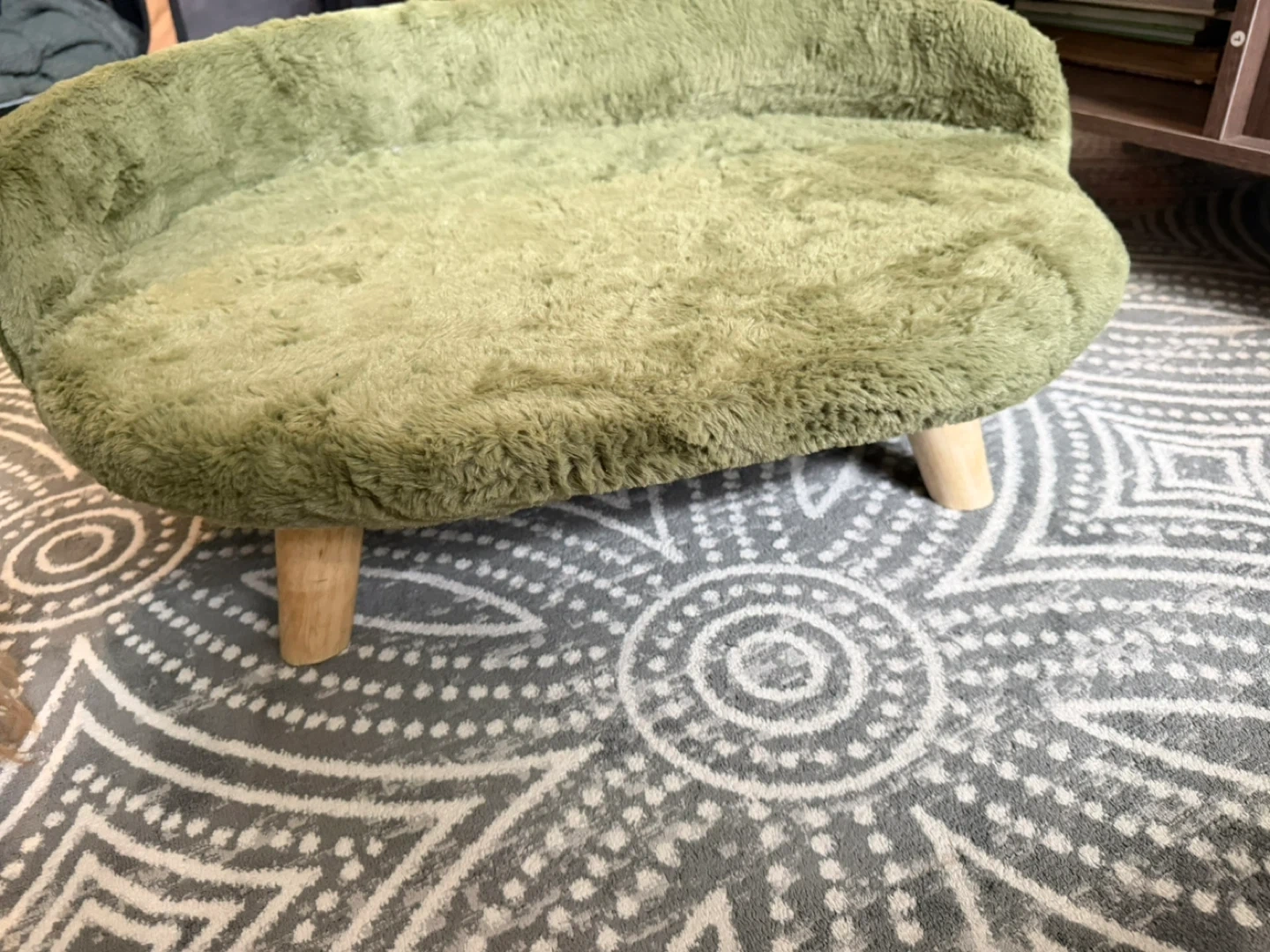 This comfy green plush pet bed features a supportive design with small wooden legs. It's soft and cozy for your furry friend to relax on. The high sides offer a sense of security for small to medium pets.
