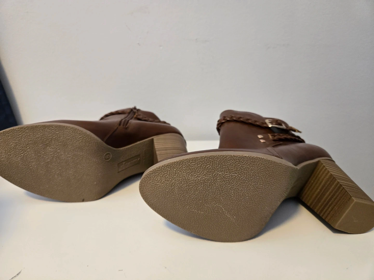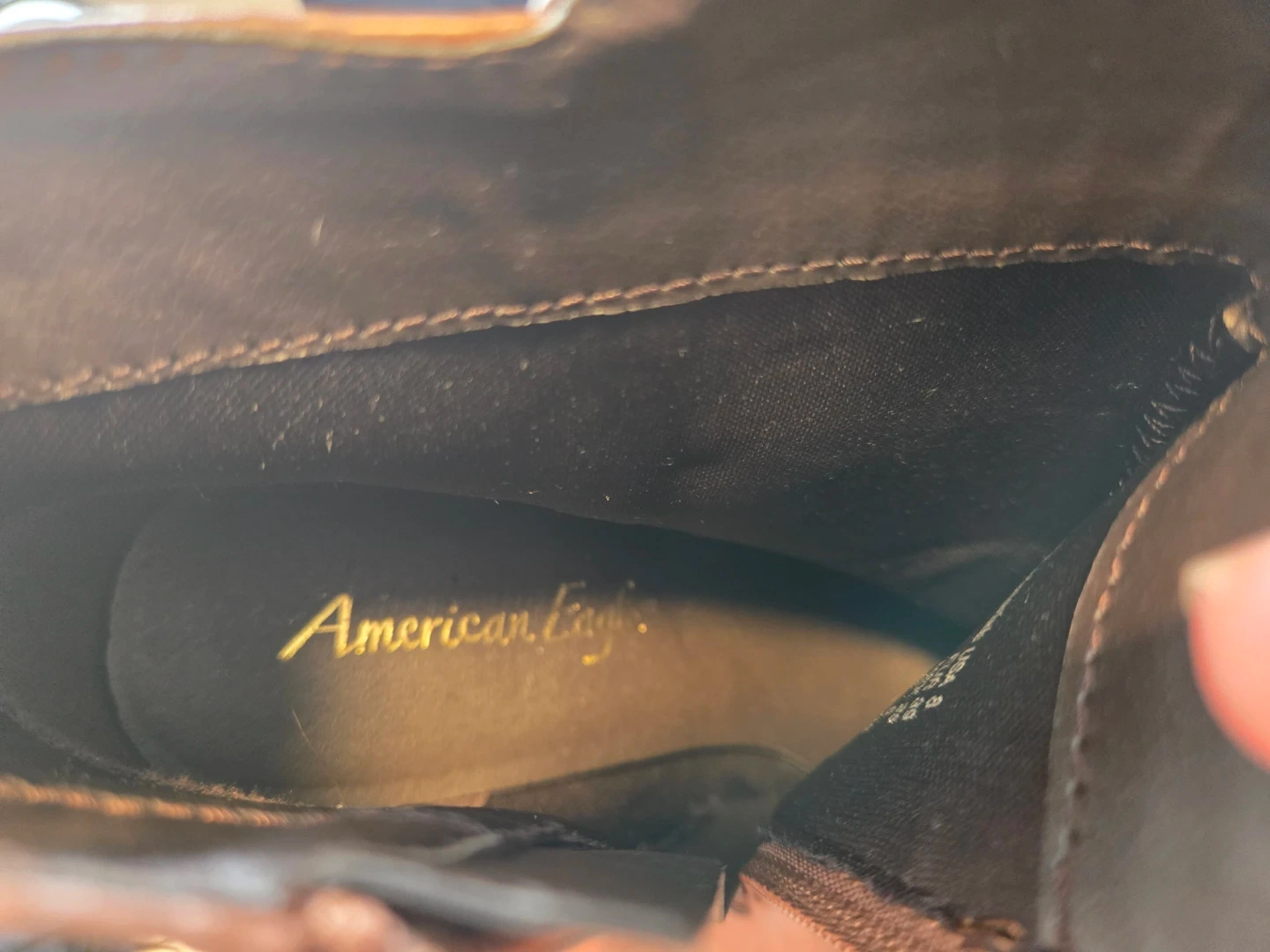These are stylish brown ankle boots from American Eagle. They feature a braided strap detail with a buckle closure. The block heel offers a comfortable lift.