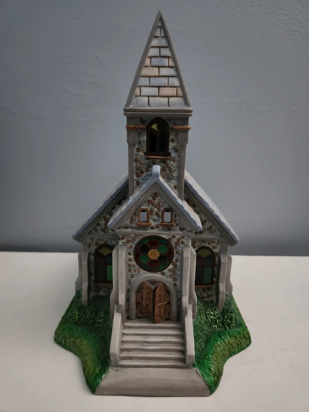 This is a collection of Partylite decorative ceramic tealight village houses. It includes a large stone house with a balcony, a quaint shop with figures and a lamp post, a charming church with stained glass details, a rustic farmhouse with a chicken and an 'EGGS' sign, and a building labelled 'Candle Shoppe'. These pieces are great for display during holidays or as year-round decor. Asking $25 each or $100 for all.