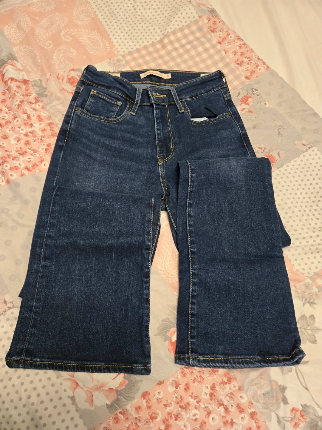 Classic Levi's 725 high rise bootcut jeans. These are a size 25 and made from denim. They've got the signature Levi's stitching and leather patch. Perfect for dressing up or down!