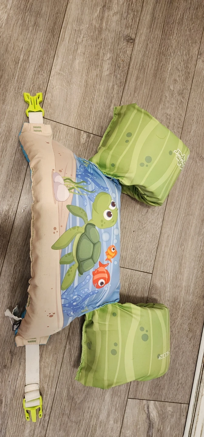 Stearns child arm floaties with a fun turtle and fish design. Features a bright green colour and adjustable straps for a secure fit. It's made for swimming fun and safety!