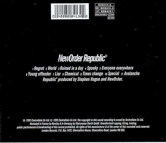 New Order Republic CD featuring tracks like Regret, Ruined in a day, and Spooky. Released in 1993. Produced by Stephen Hague and New Order. This CD is a great addition to any music collection.
