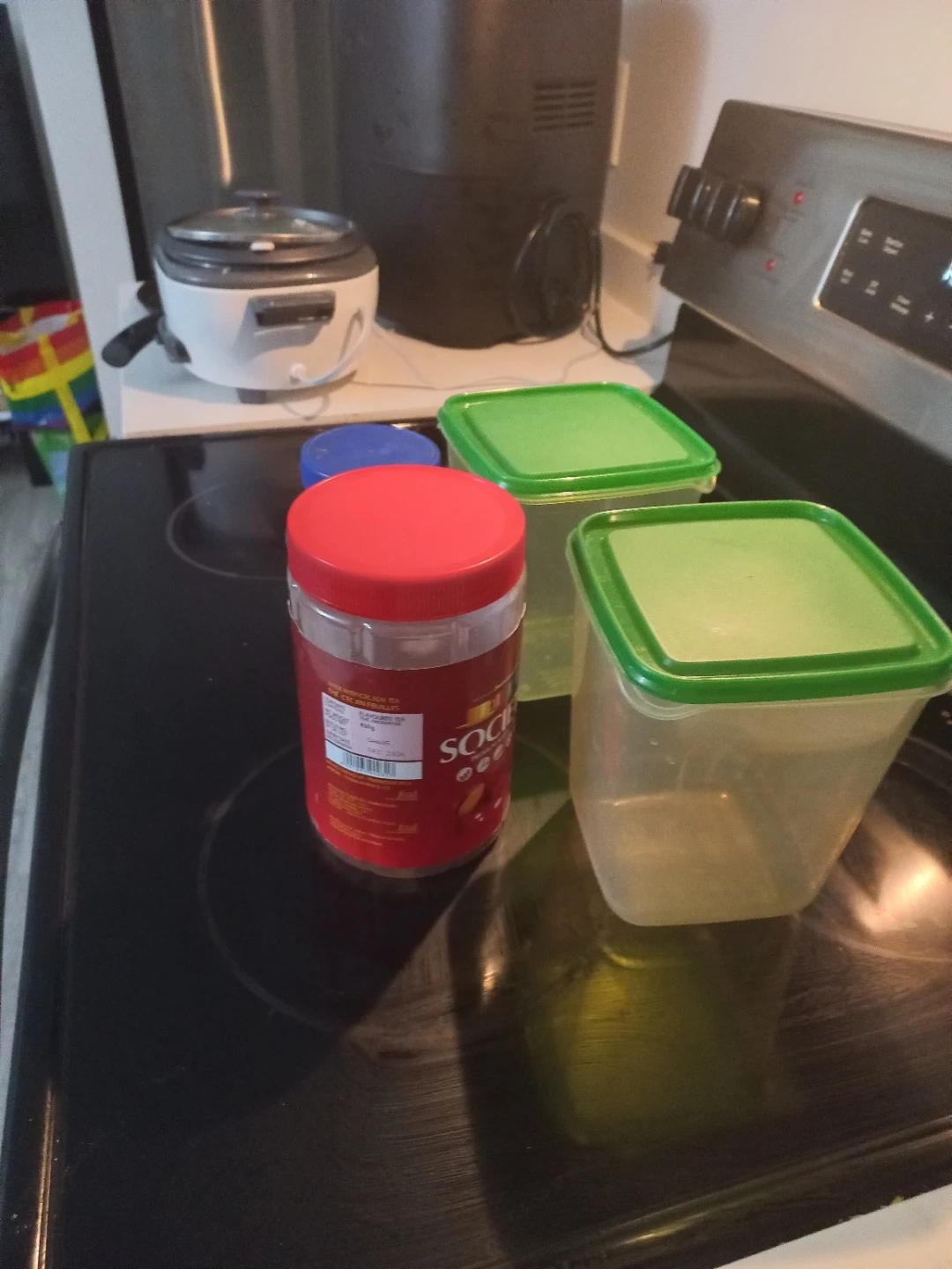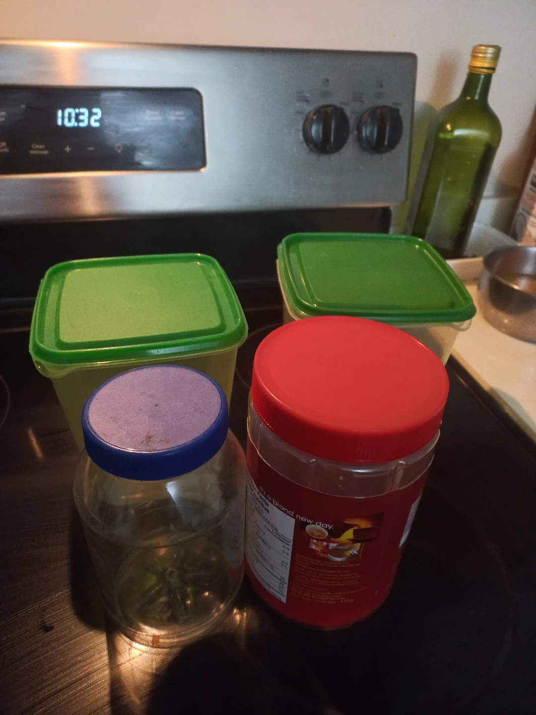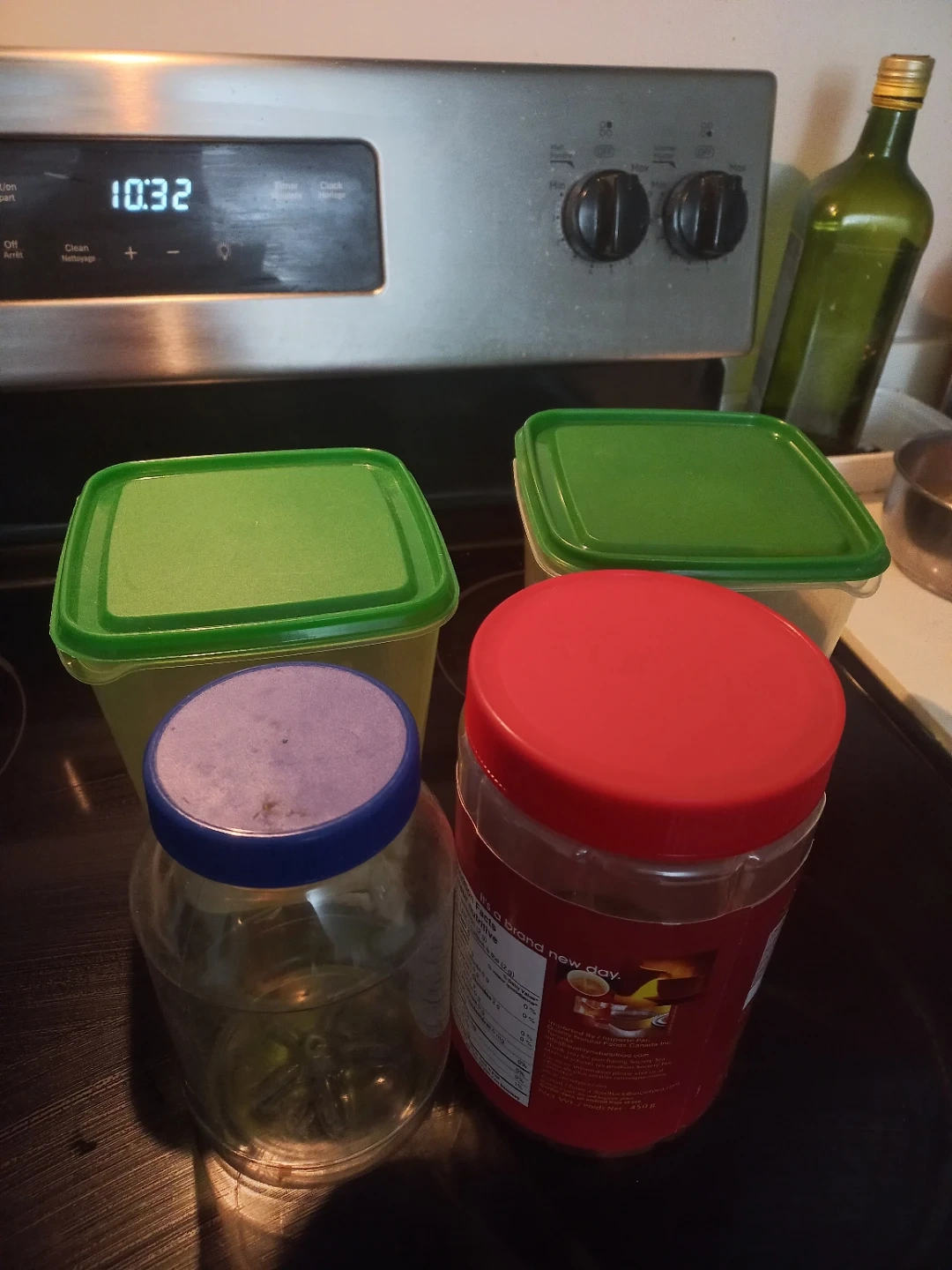 Four food storage containers with lids. Includes two square green-lid containers and one large red-lid peanut butter jar that can be reused as storage. Also includes a smaller clear jar with a blue and purple lid. Great for leftovers or organizing your pantry!