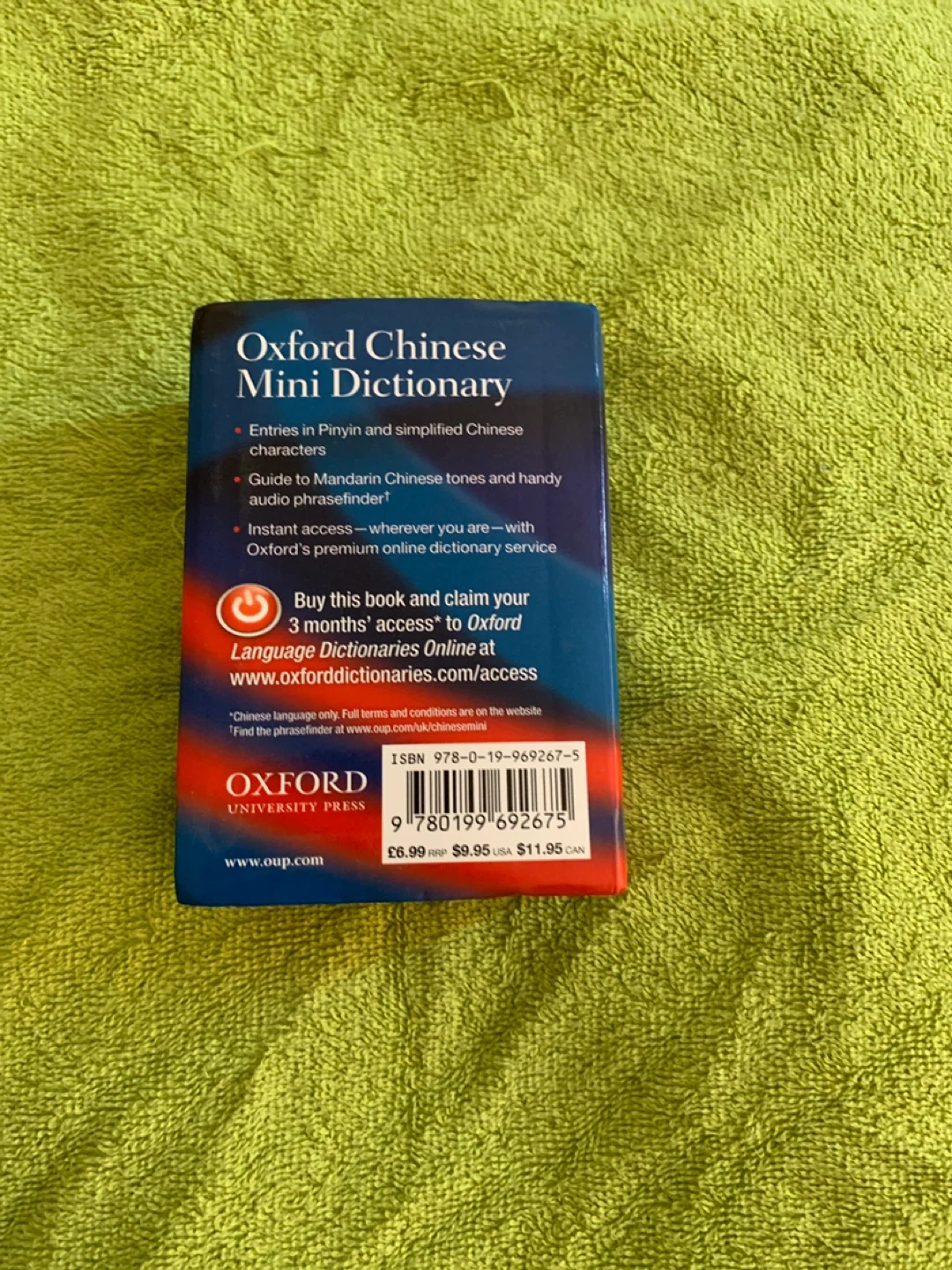 This is the Oxford Chinese Mini Dictionary. It contains entries in Pinyin and simplified Chinese characters, plus a guide to Mandarin Chinese tones. It also provides instant access to Oxford's premium online dictionary service for 3 months. This pocket-sized dictionary is useful for travellers and students alike.