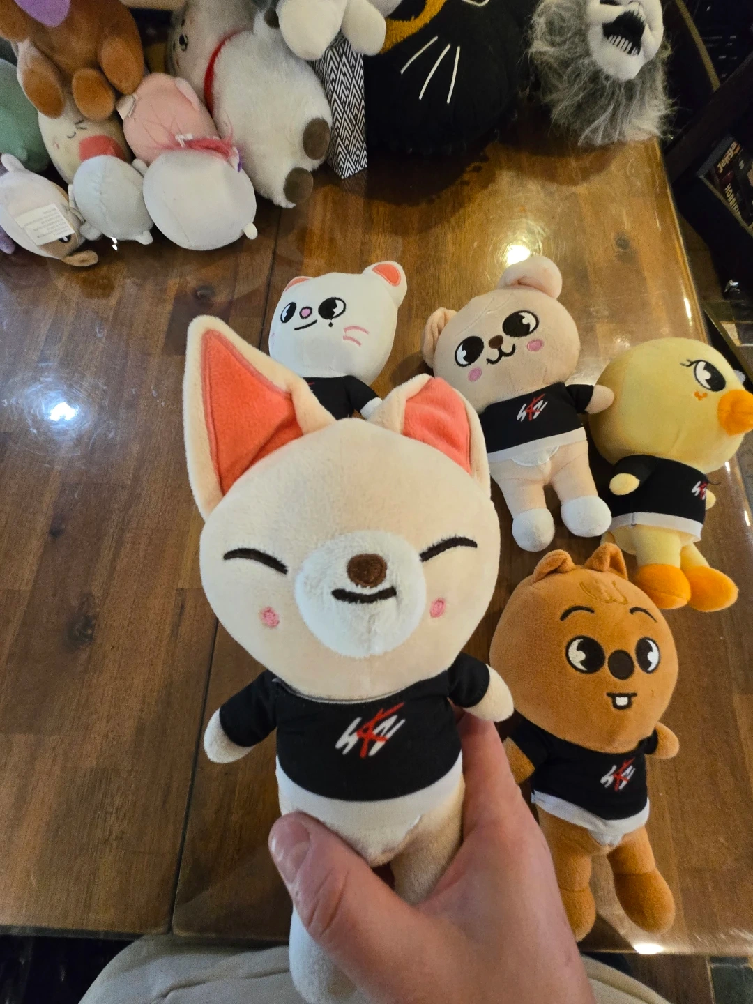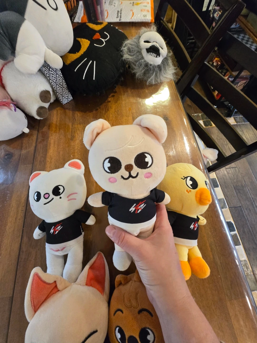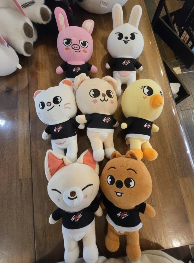This is a white SKZOO plush toy, featuring a bunny character. It's wearing a black shirt with a red and white logo. Soft and cuddly, it's perfect for any fan! 55 for all or 10 each