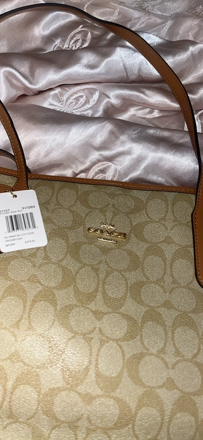 This Coach City Tote Bag is made with their signature print PVC material and features tan leather trim. It's a practical size for everyday use. Comes with original tag.
