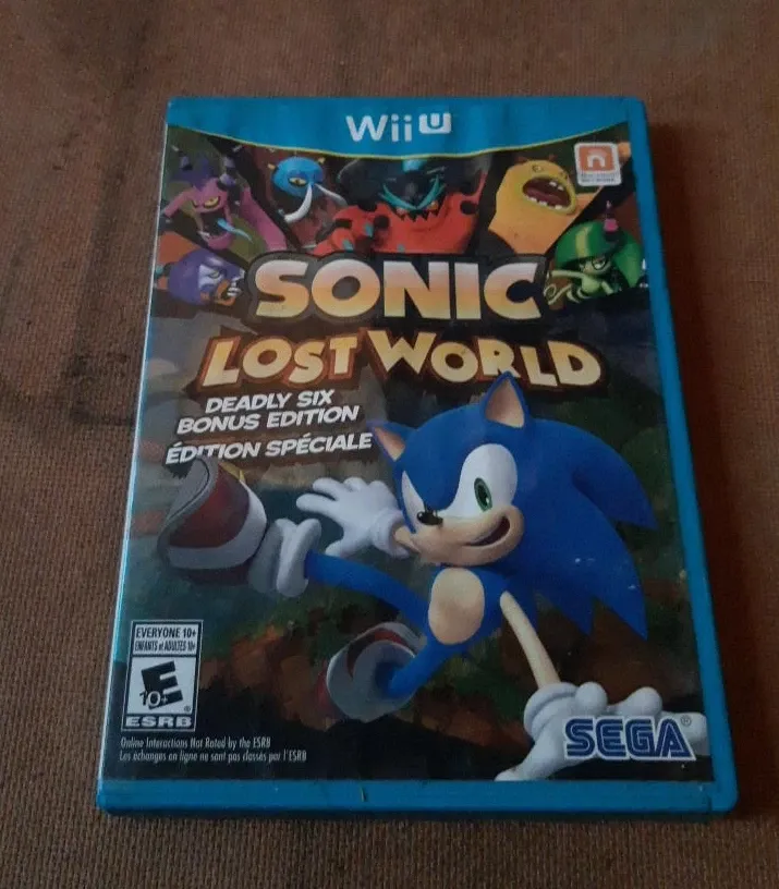 Sonic Lost World for the Wii U. This is the Deadly Six Bonus Edition, featuring extra content. It's rated E for Everyone 10+ by the ESRB. Minor water damage but game is fine.