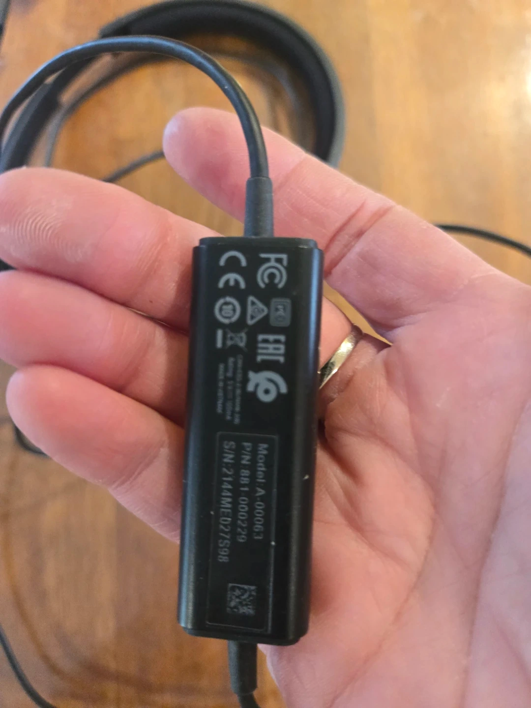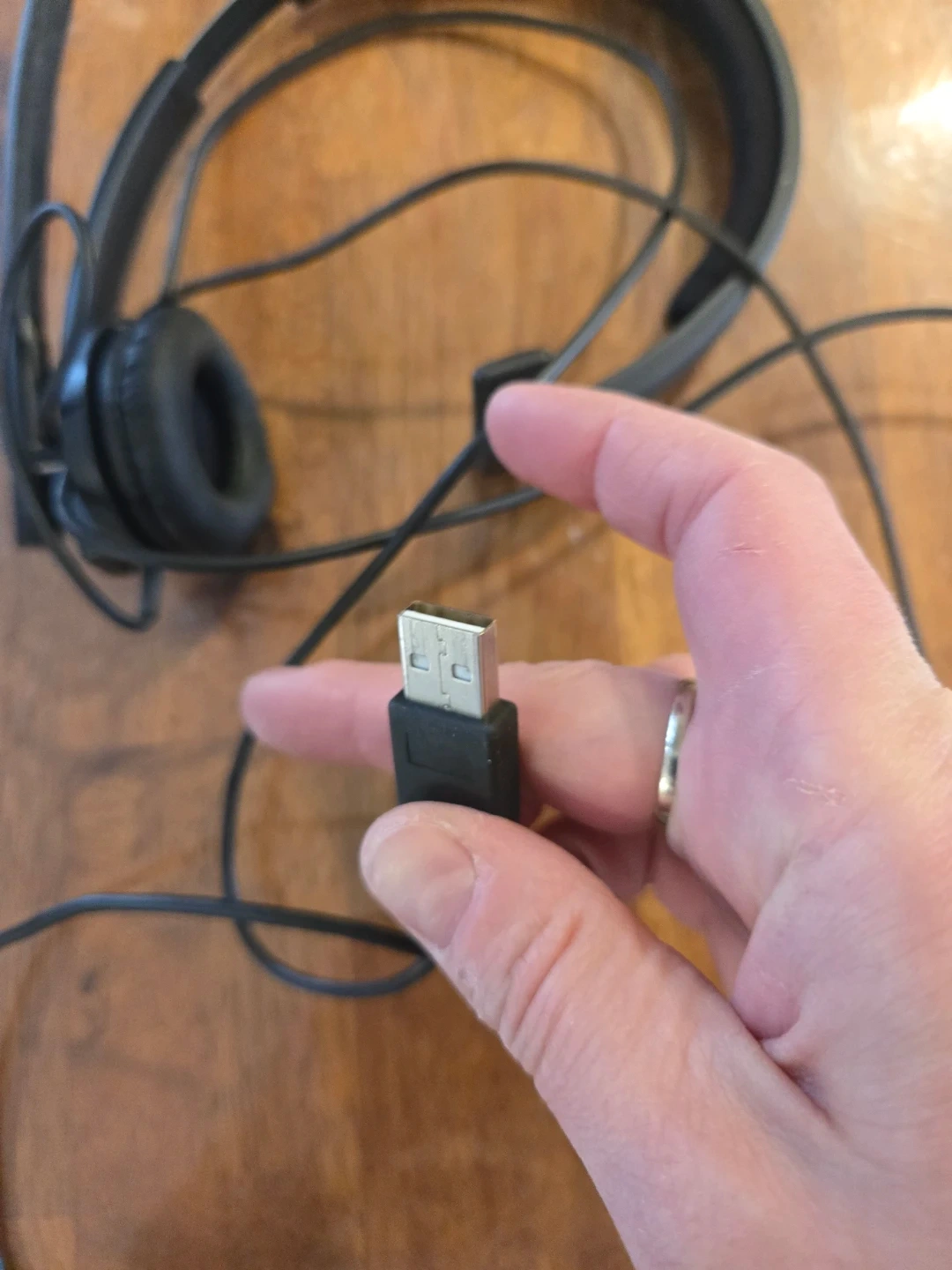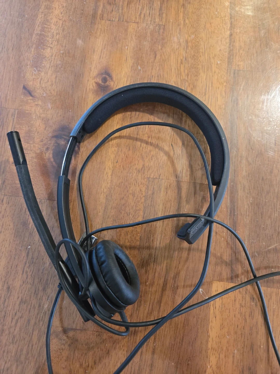 This is a Logitech USB headset with a boom microphone. It's lightweight and comfortable for long wear. The adjustable headband ensures a good fit for most users.
