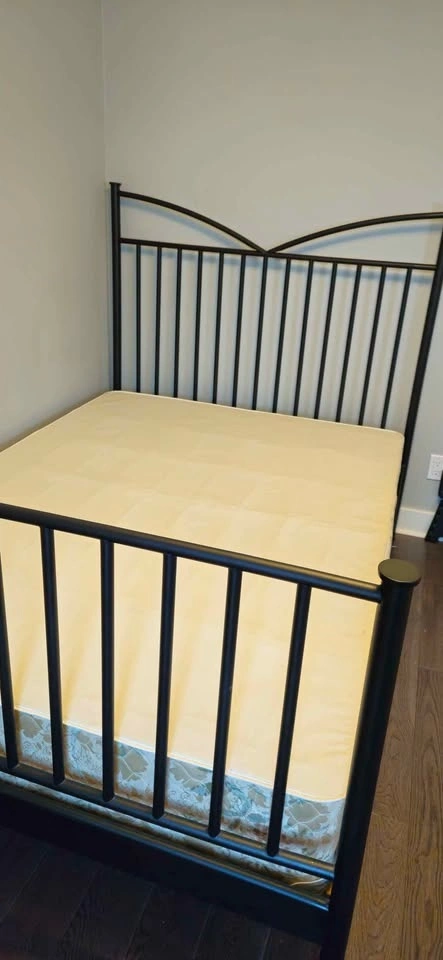 IKEA Halden black metal bed frame, includes slats, all hardware, and instruction manual. Bed is in perfect condition. Also included is a Sealy Posture Premier mattress and box spring. The mattress has some damage but would be fine with a memory foam topper. Pick up only. Smoke free, pet free home.