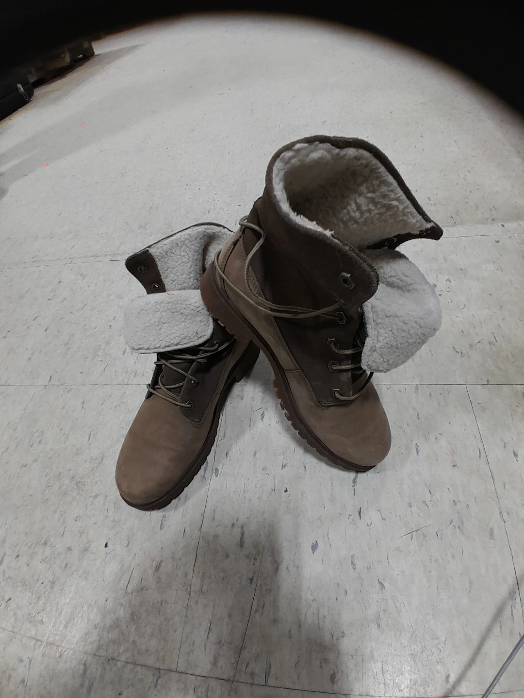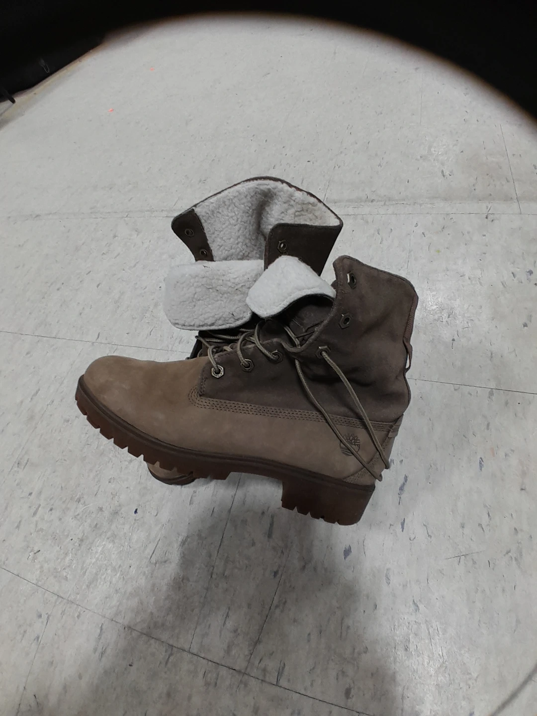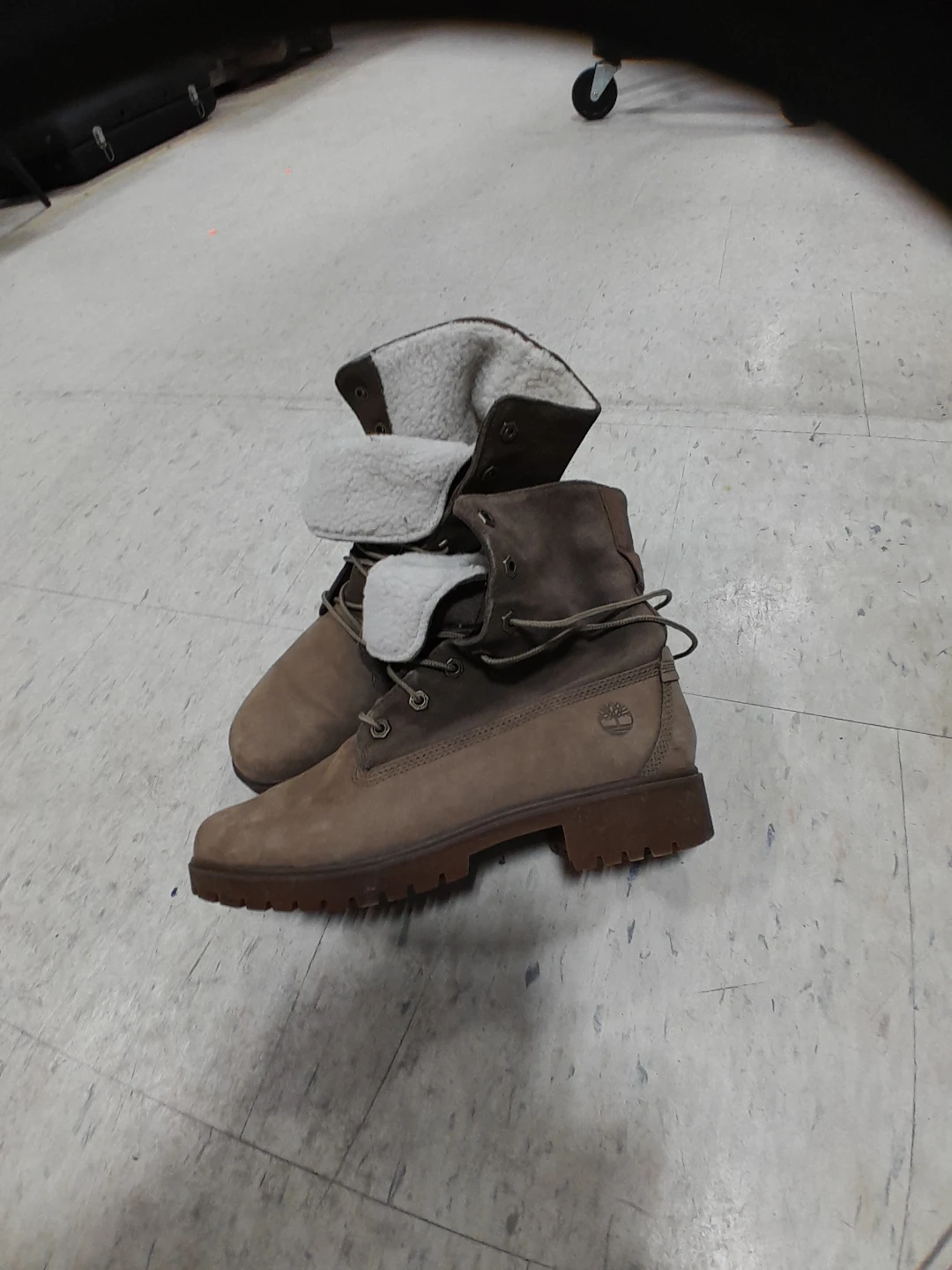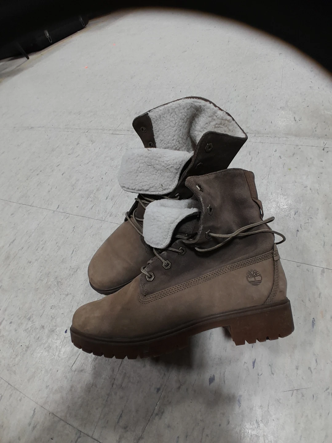 Timberland winter women's boots with a fold-down cuff lined with cozy shearling. These boots feature a lace-up closure and durable rubber soles. Great for keeping your feet warm on chilly days! Size 8.5