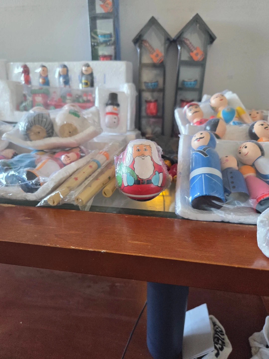A collection of charming wooden nesting dolls, including Santa Claus, and various other folk art-style figurines. These decorative pieces are perfect for display during the holiday season or as unique collectibles. Their intricate designs add a touch of cultural artistry to any home.