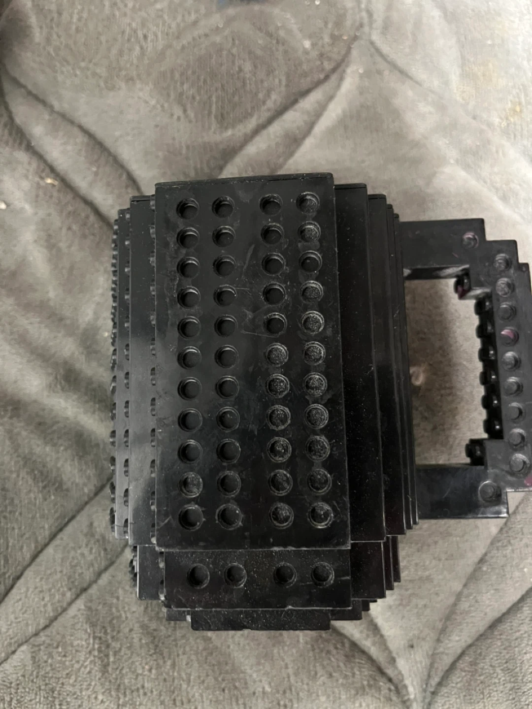 This is a black mug constructed from building block pieces. It has a handle and a cylindrical opening. Perfect for your morning coffee or tea!