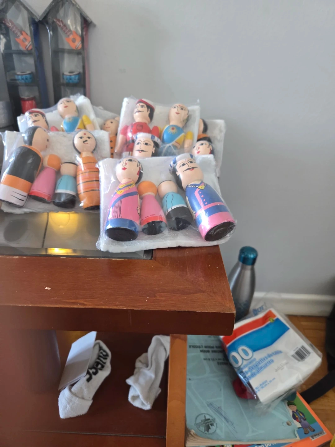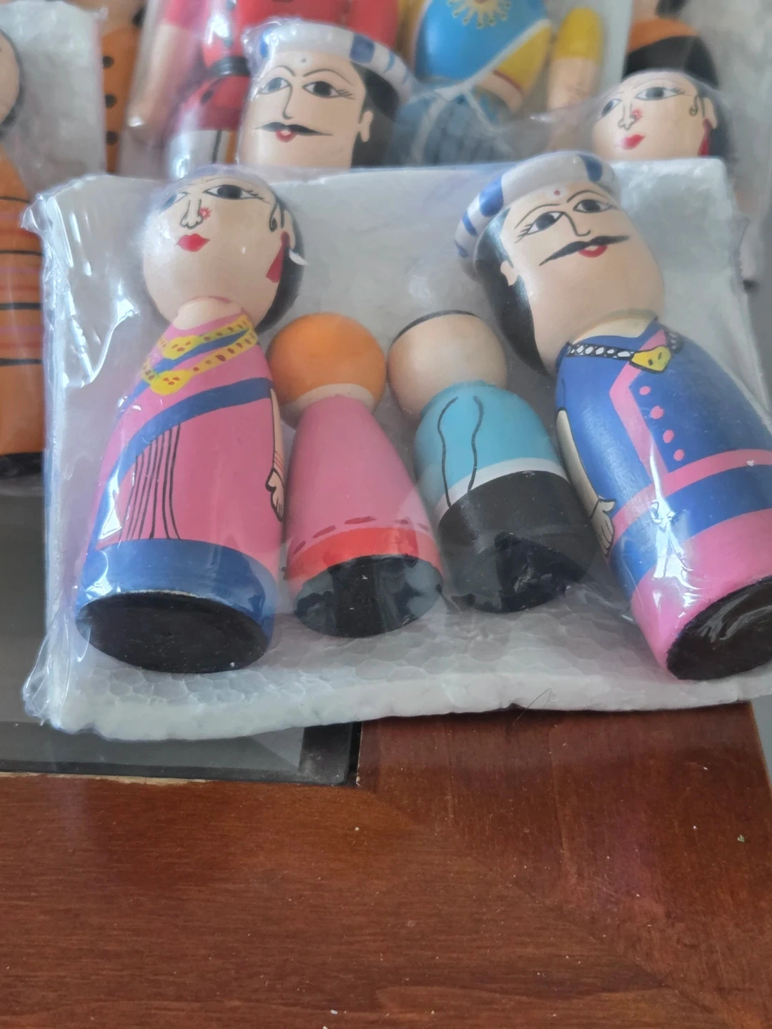 A charming set of four wooden family figurines, hand-painted in vibrant colours. These dolls are decorative and would make a lovely addition to a shelf or display. They're made from wood.