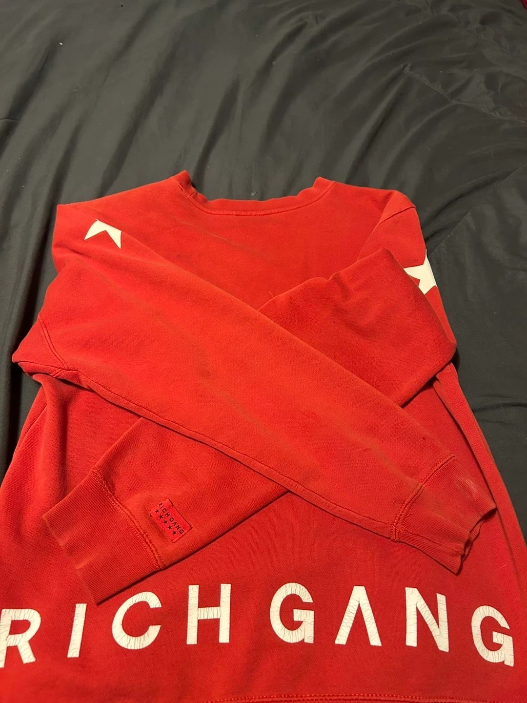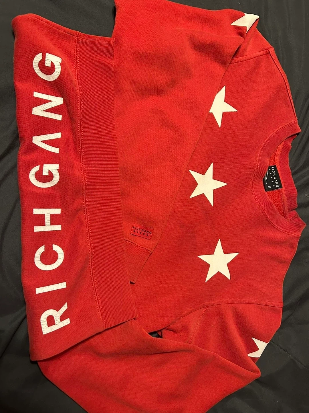 This is a RICH GANG sweatshirt in red. It features white stars on the front and sleeves. There's also "RICH GANG" text printed vertically on the left sleeve. Size is small.