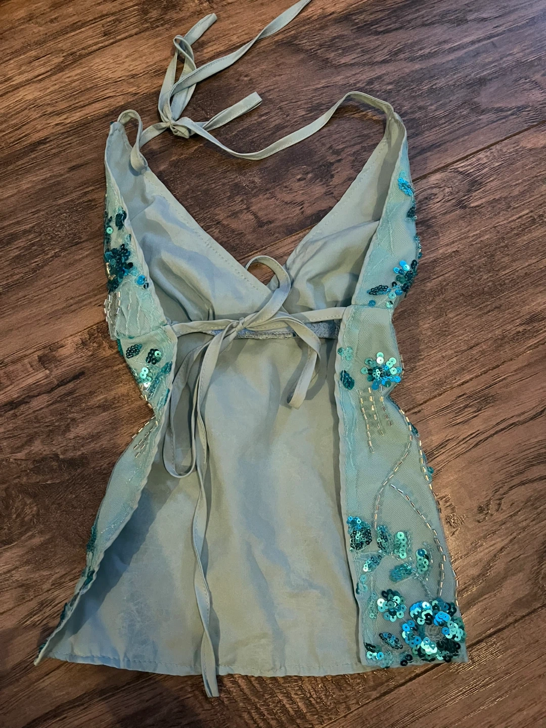 Light blue halter top with all-over sequin and beads, similar to the top from peppermayo. Perfect for a night out. It’s not damaged and has been worn once. Comes from a smoke free and pet free home