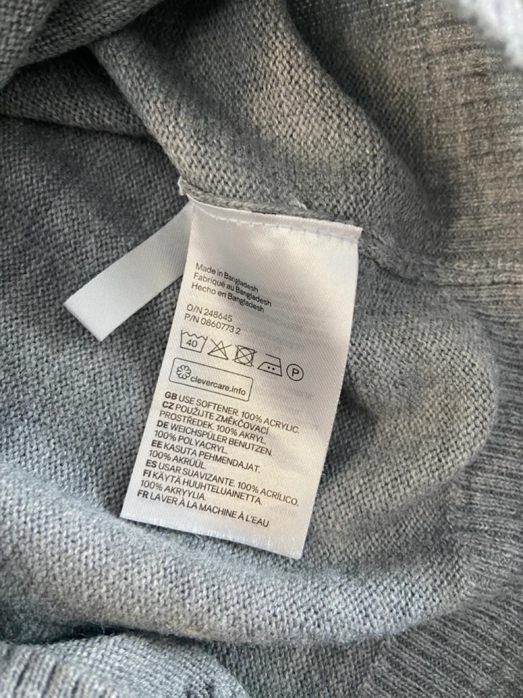 This H&M sweater features a fun pixelated reindeer graphic with sunglasses and the slogan "DEER TO BE COOL". It's a grey, long-sleeved knit suitable for casual wear. Made from 100% acrylic.