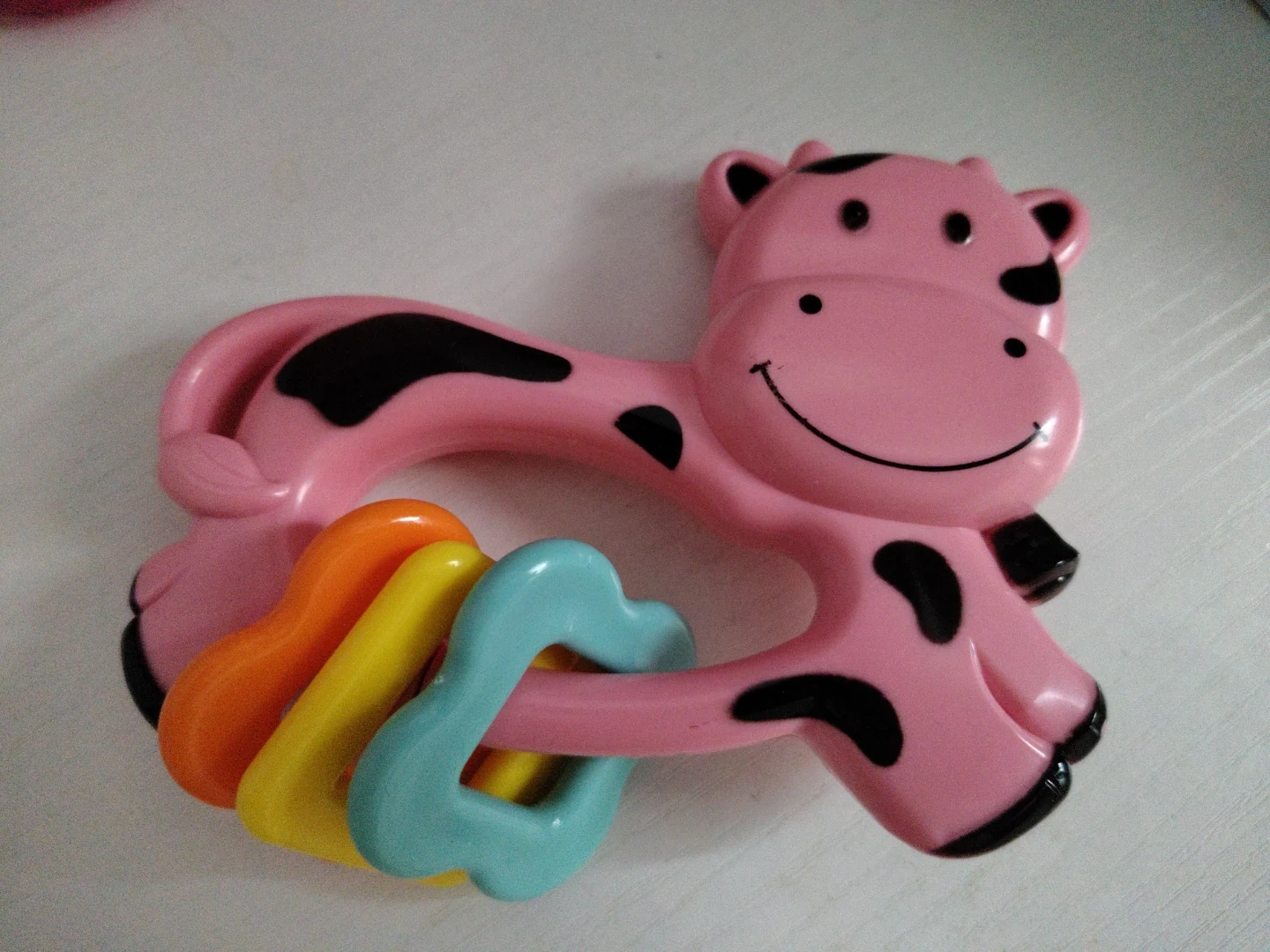 FREE π This pink cow rattle and teether toy is designed for little ones. It's made of durable plastic and features multiple colorful rings for teething. Babies can grasp it easily for play and soothing discomfort.