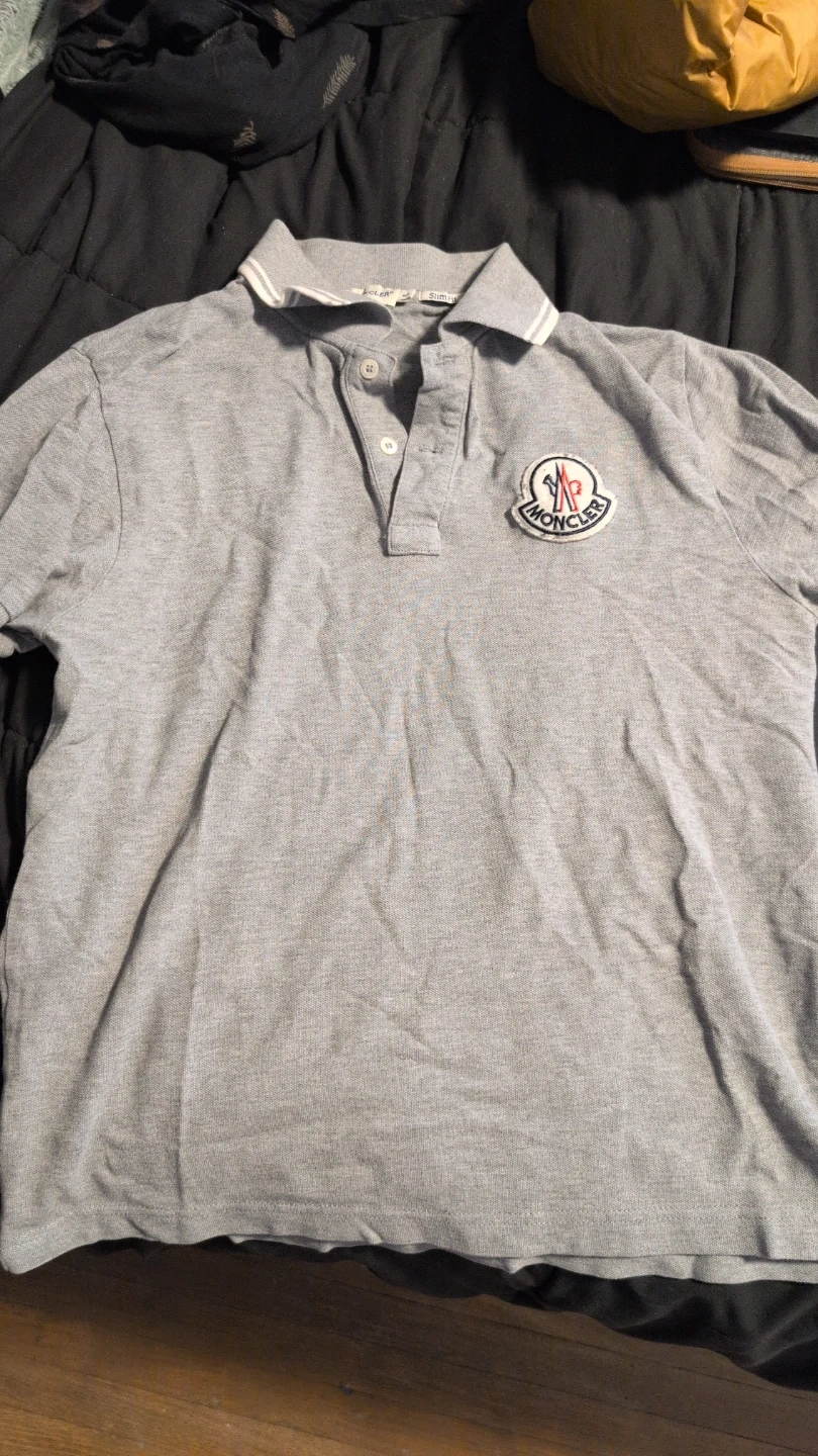 Moncler polo shirt in a heather grey colour. It's a men's size medium. Features the iconic Moncler logo patch on the chest.