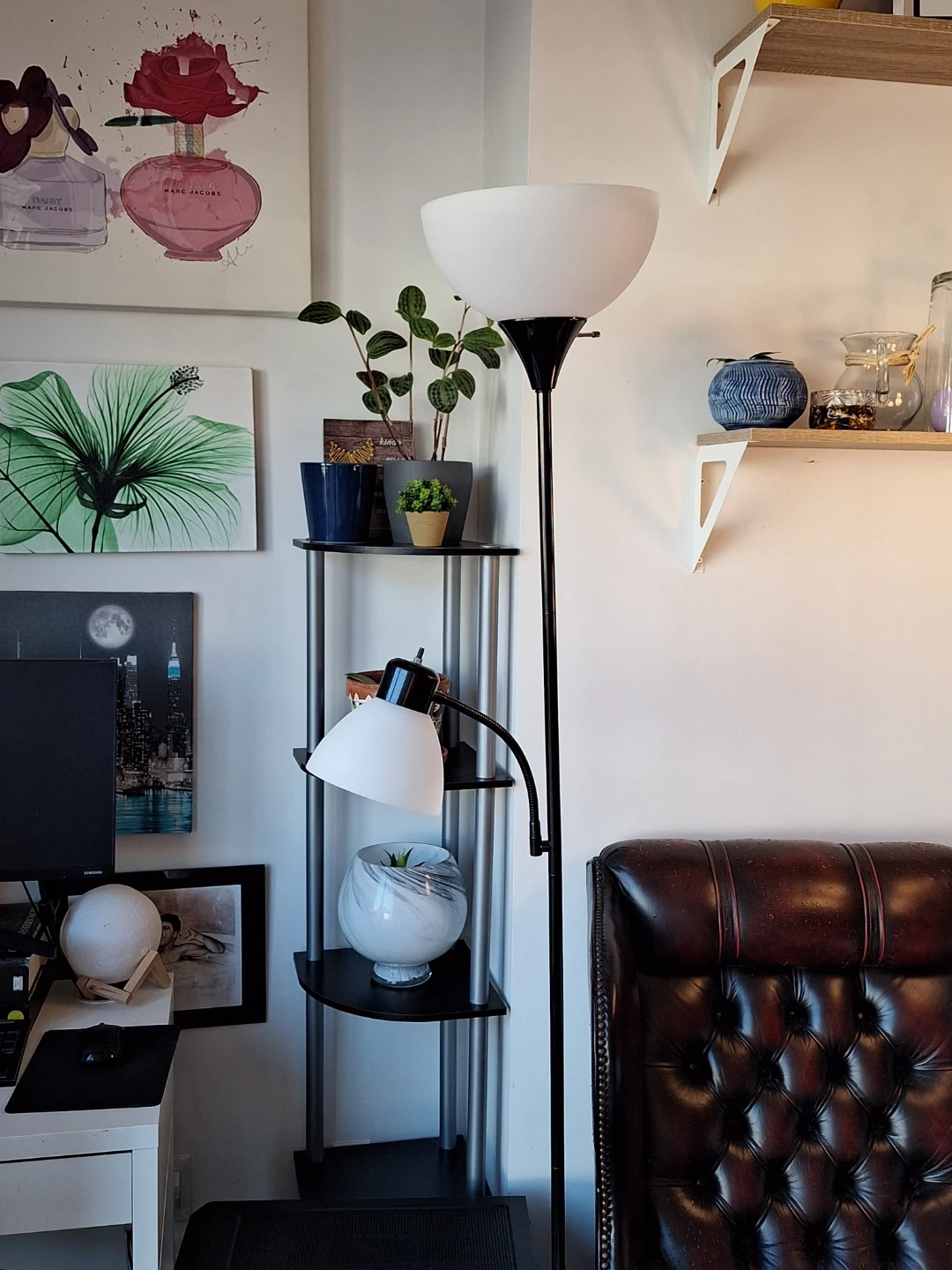 This black floor lamp has a dimmable main light and an adjustable reading light. It's made of metal with frosted shades. Provides ambient and task lighting.