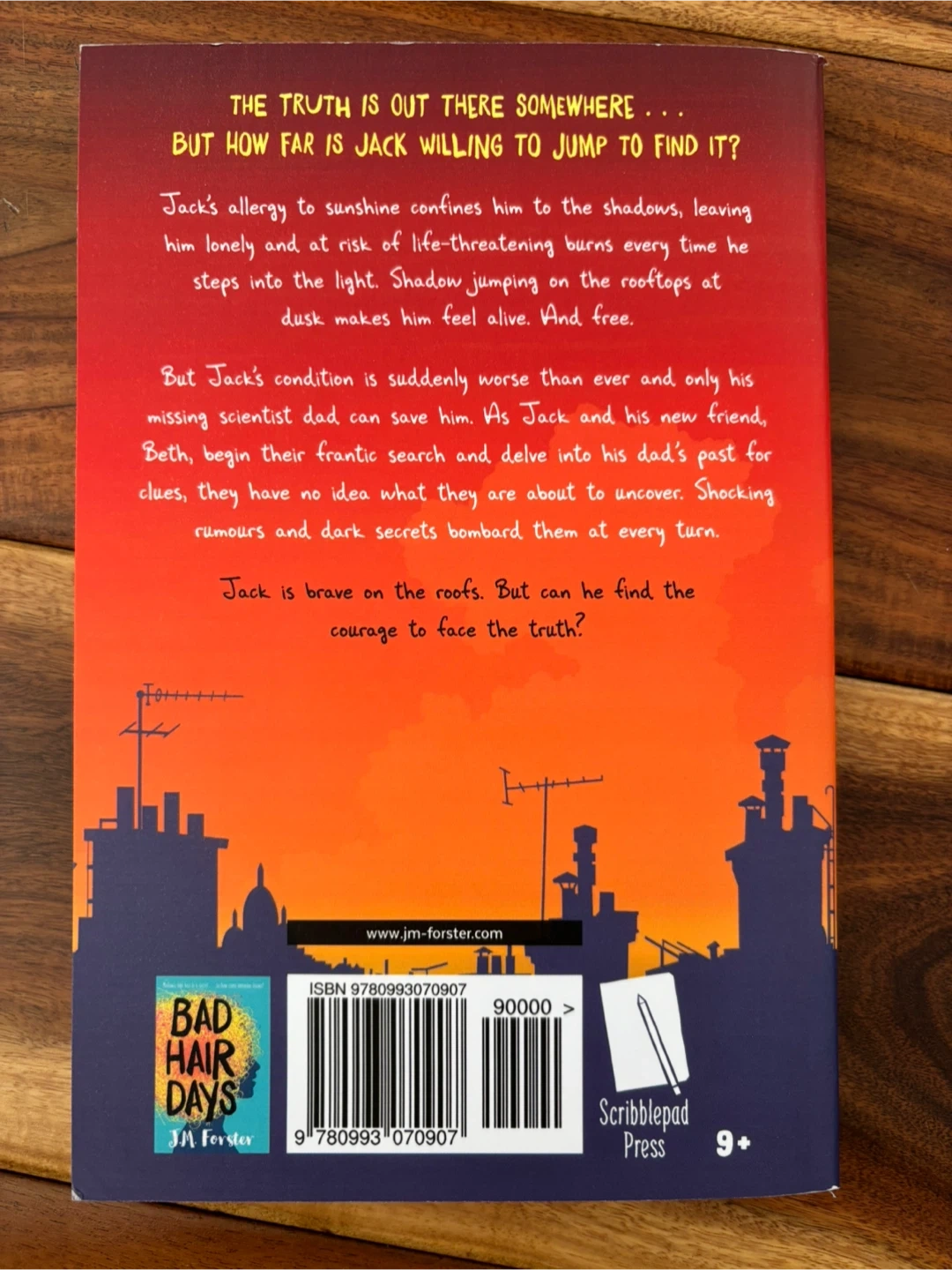 The truth is out there somewhere . . . but how far is Jack willing to jump to find it? Jack Phillips's allergy to sunshine confines him to the shadows, leaving him lonely and at risk of life-threatening burns every time he steps into the light. Shadow jumping on the rooftops at dusk makes him feel alive. And free. But Jack's condition is suddenly worse than ever and only his missing scientist dad can save him. As Jack and his new friend, Beth, begin their frantic search and delve into his dad's past for clues, they have no idea what they are about to uncover. Shocking rumours and dark secrets bombard them at every turn. Jack is brave on the roofs. But can he find the courage to face the truth?