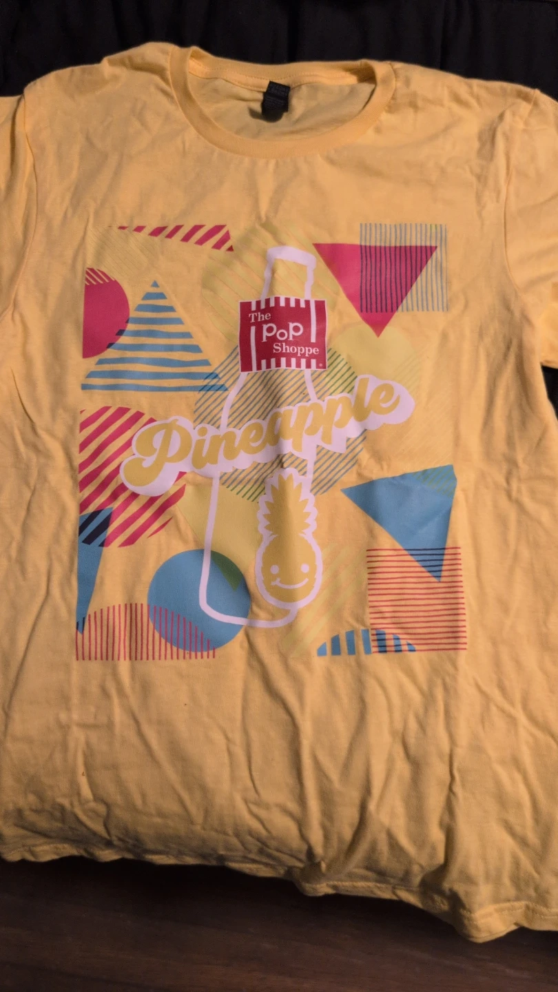 This is a yellow t-shirt from The Pop Shoppe featuring a graphic of a pineapple and the word 'Pineapple'. It's made of comfortable material. It's a fun shirt for fans of the brand!