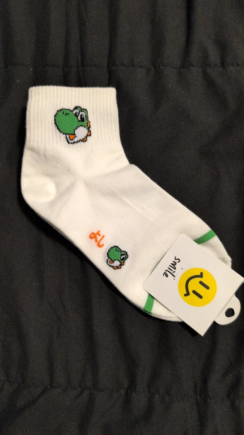 Comfortable white ankle socks featuring a fun Yoshi design. They're made from a soft, breathable material for all-day wear. Ribbed cuff keeps them in place. Perfect for any Nintendo fan!