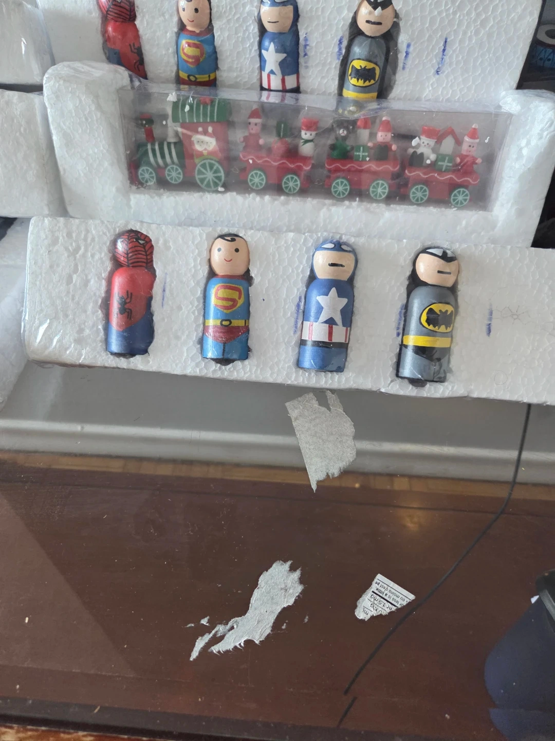 This set includes several superhero figurines like Superman, Captain America, Batman, and Spider-Man. It also features a festive Christmas train with characters. These wooden peg-style figures are great for display or play!