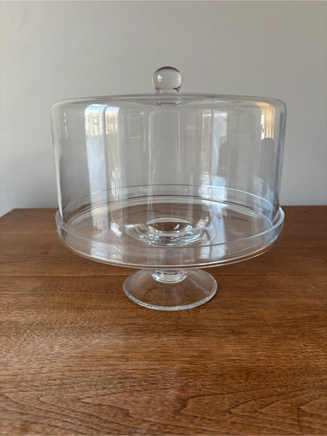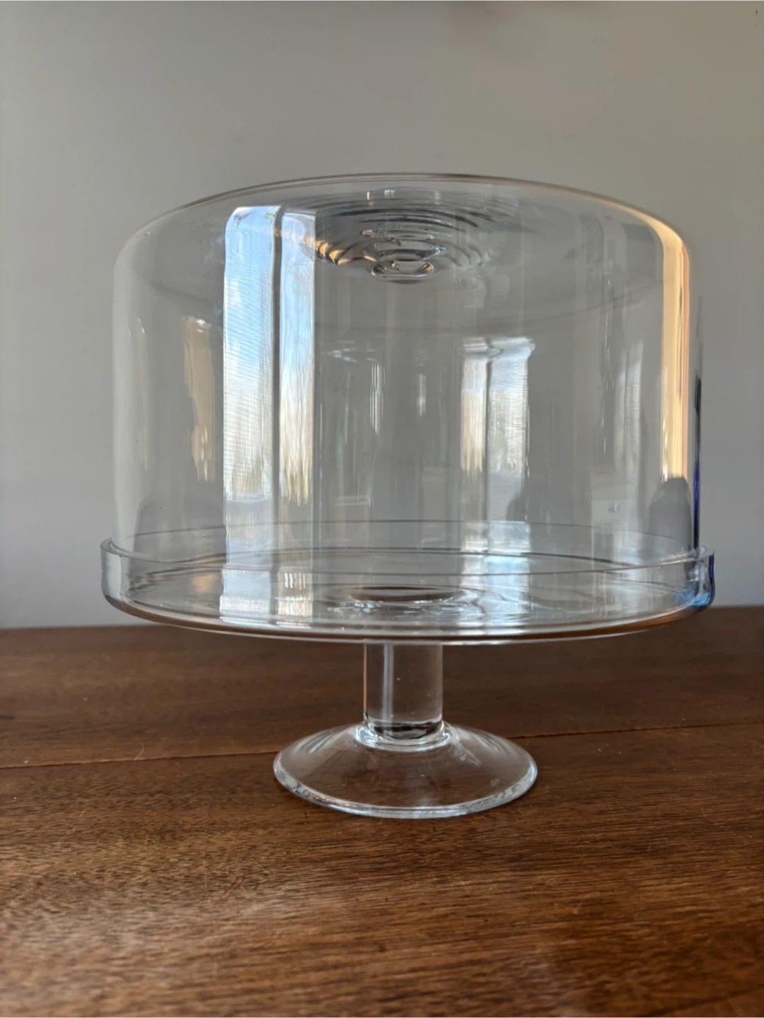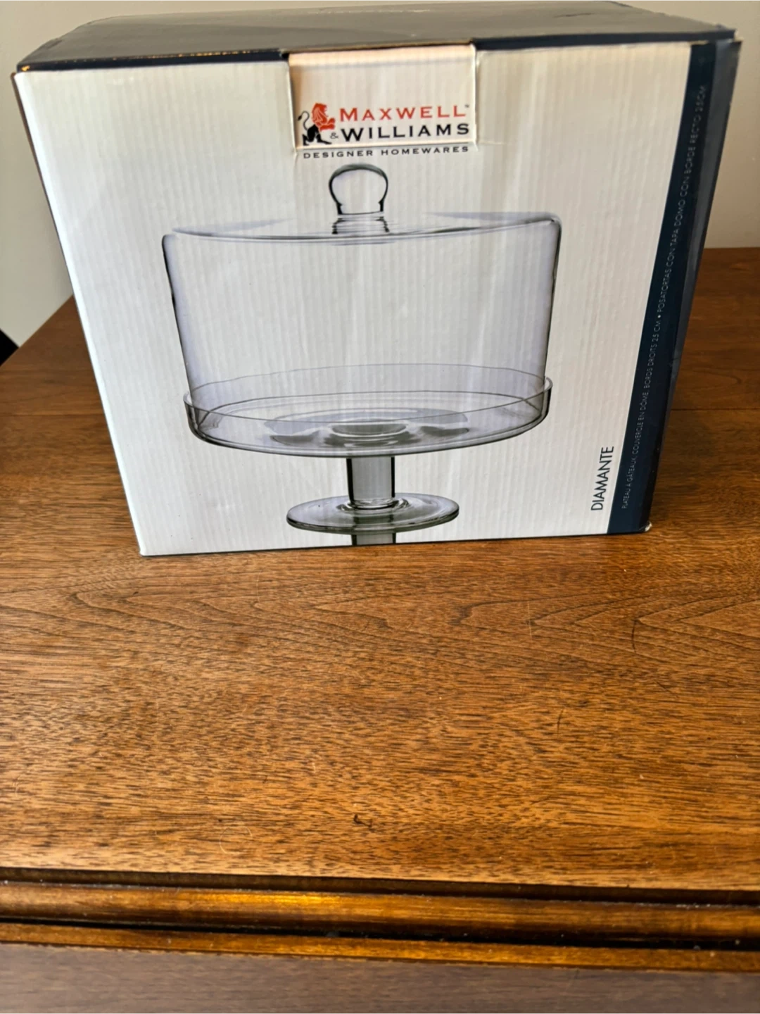Glass cake stand and dome from Maxwell & Williams. It's made of clear glass. This item includes the original box and packaging. In overall good condition excluding a very tiny chip on the base ( refer to the last photo). 10” wide and stands at 9.5” tall. Cash only.