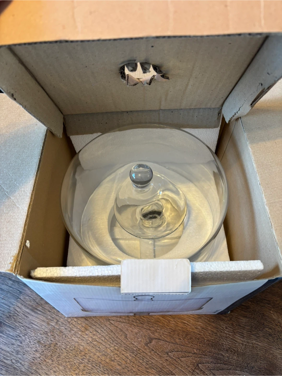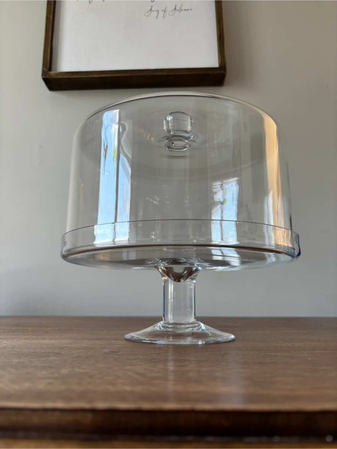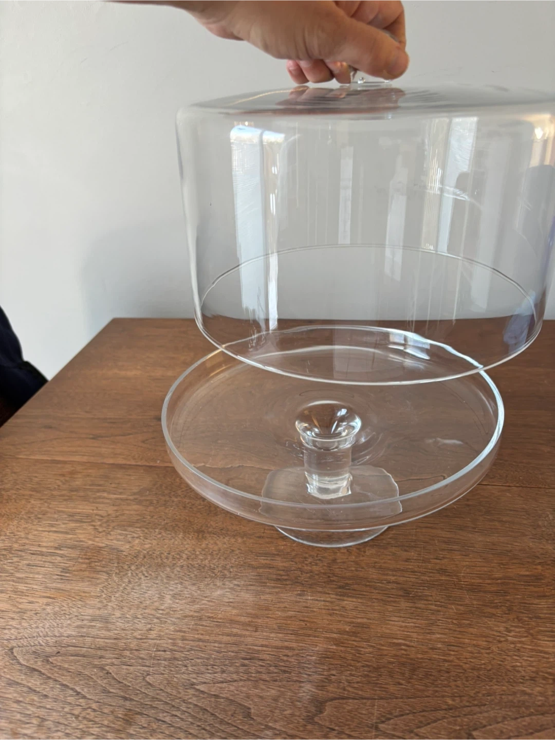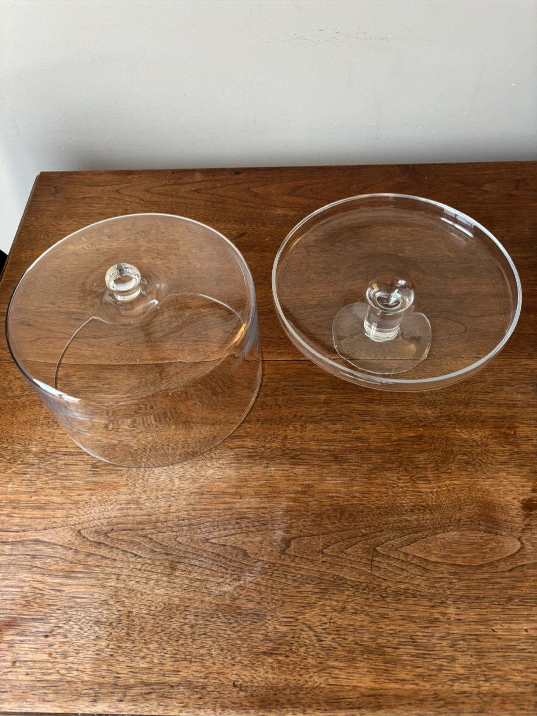 Glass cake stand and dome from Maxwell & Williams. It's made of clear glass. This item includes the original box and packaging. In overall good condition excluding a very tiny chip on the base ( refer to the last photo). 10” wide and stands at 9.5” tall. Cash only.