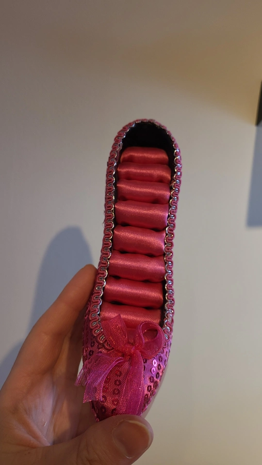This decorative high heel shoe is covered in pink sequins. It has a satin-lined interior with multiple slots for holding rings. A small pink ribbon bow adorns the toe.