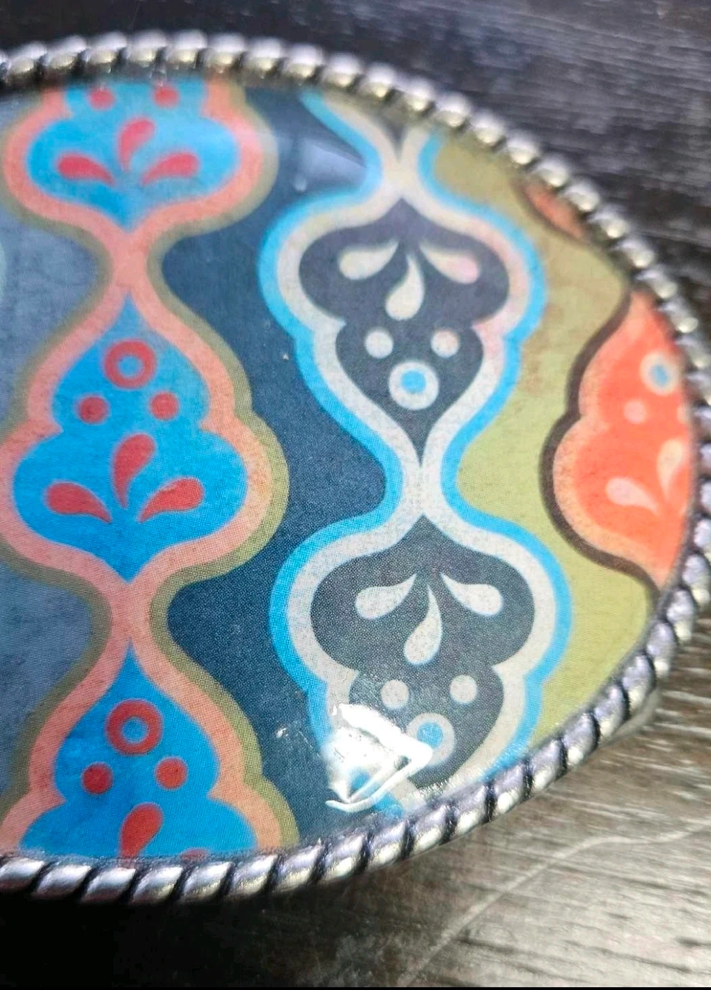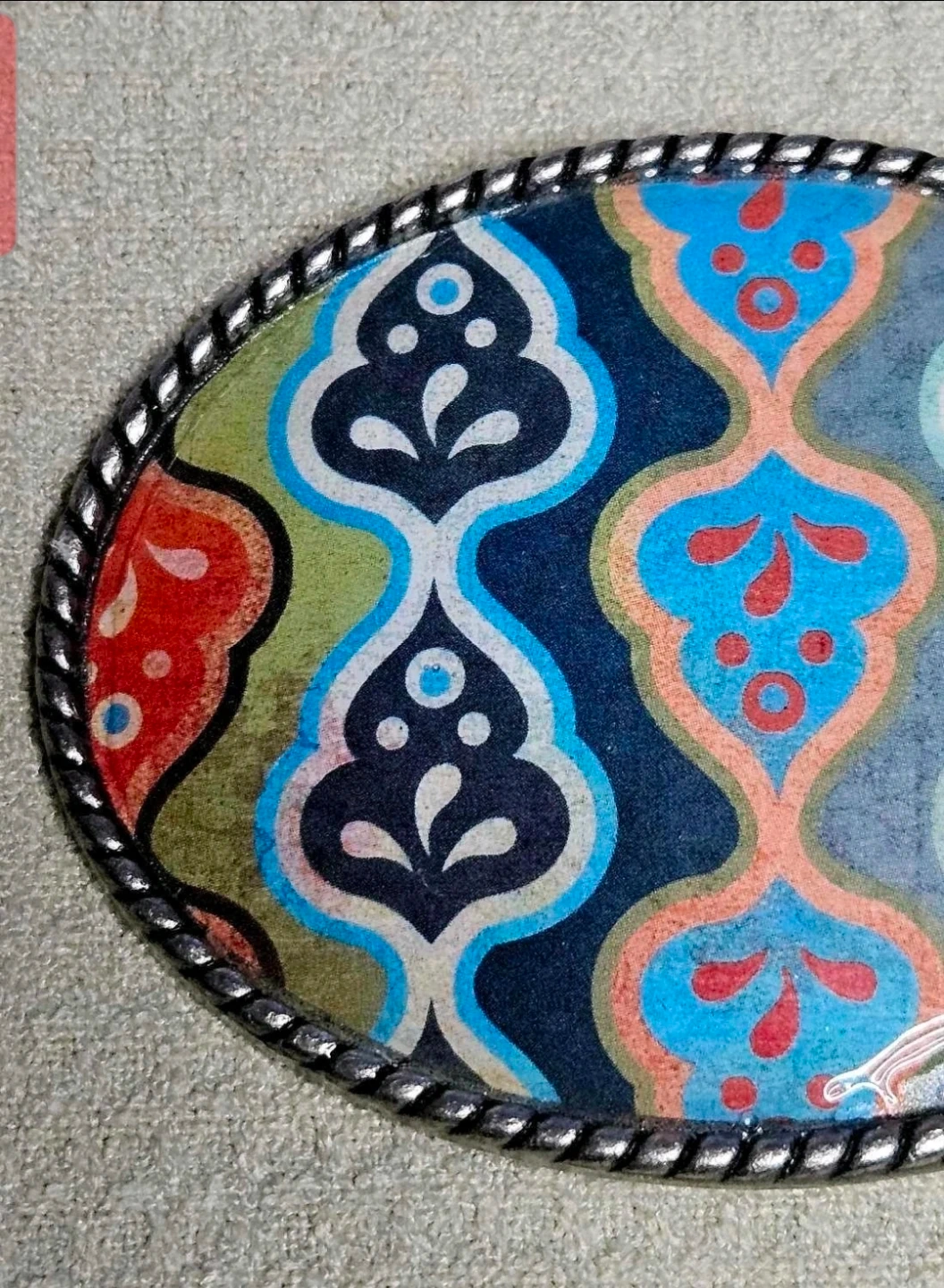 This oval belt buckle features a vibrant, colourful pattern with blues, greens, oranges, and reds. It has a decorative silver-toned rope-style edge. It's a stylish accessory for any belt!