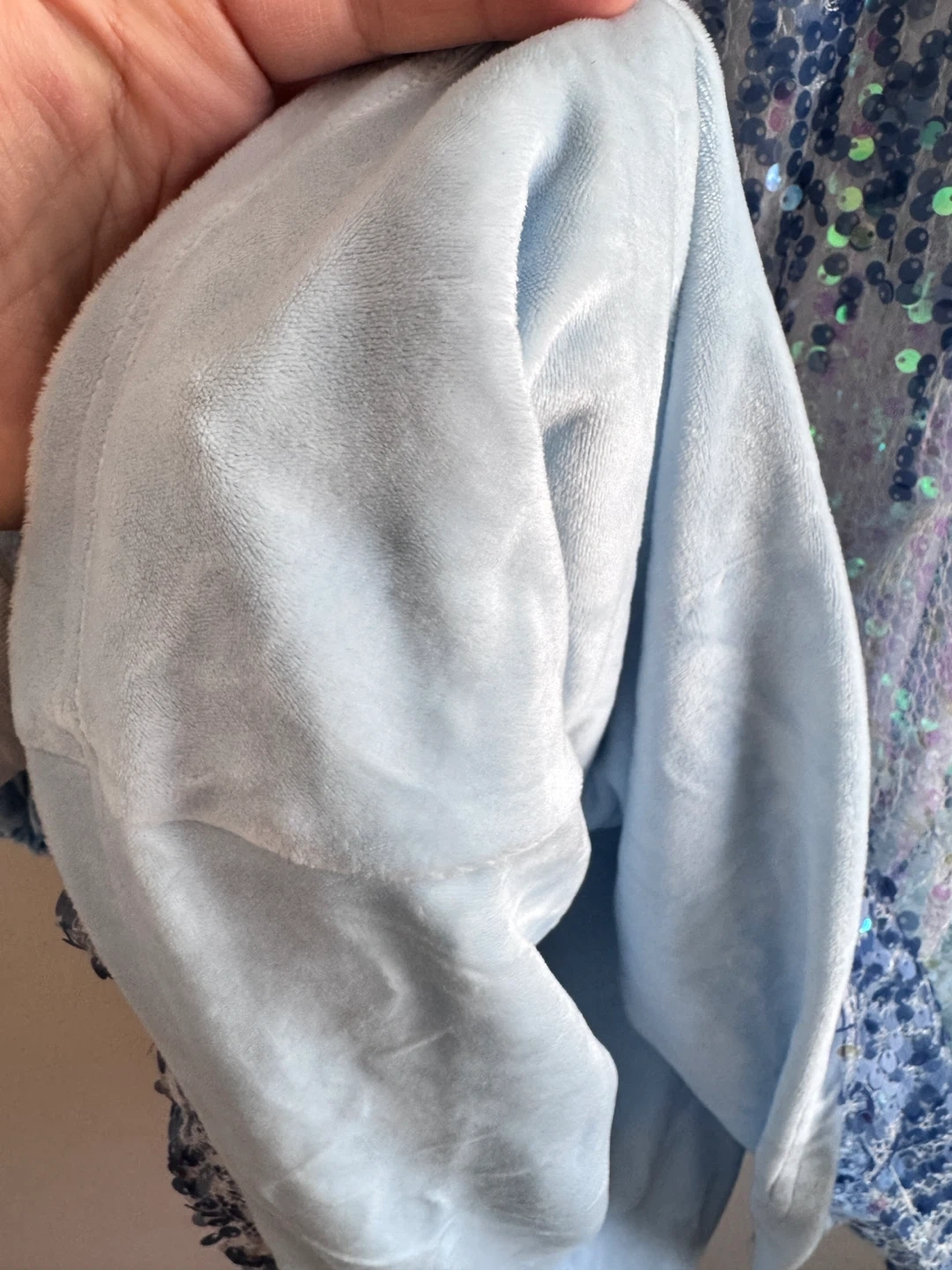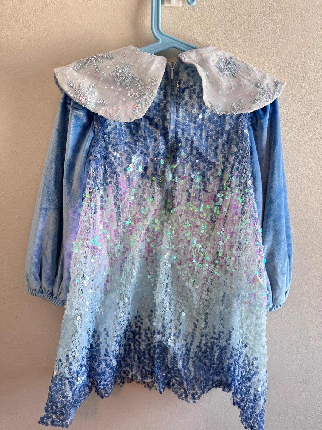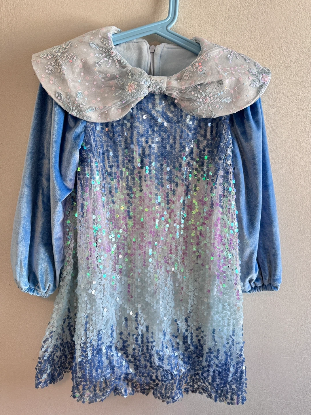 A lovely blue dress featuring sparkling sequins. It's made with soft velvet on the sleeves and collar. This dress is perfect for special occasions or playtime dress-up!