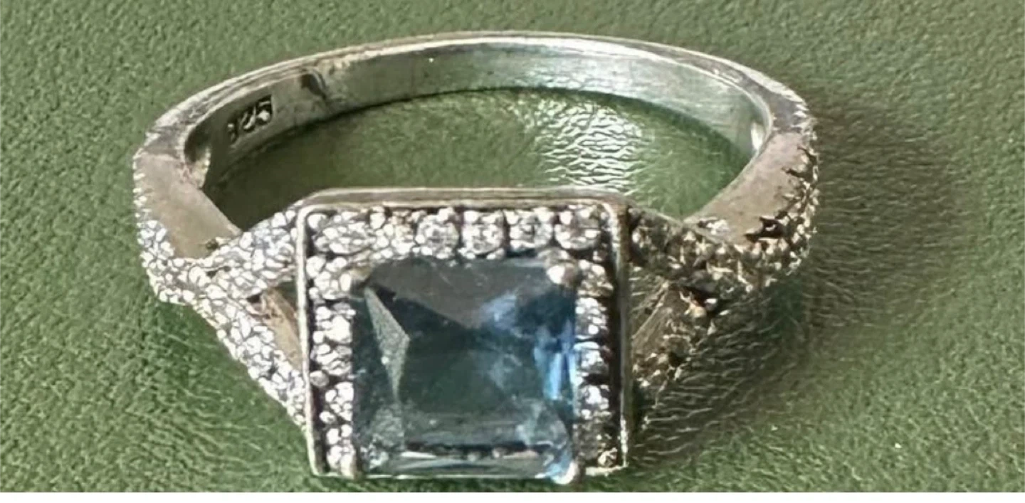 A lovely sterling silver ring featuring a square-cut blue stone surrounded by small, clear stones. The band has a decorative, twisted design. It's stamped with "925" indicating sterling silver quality. This ring adds a touch of elegance to any outfit!