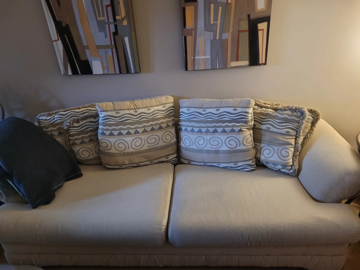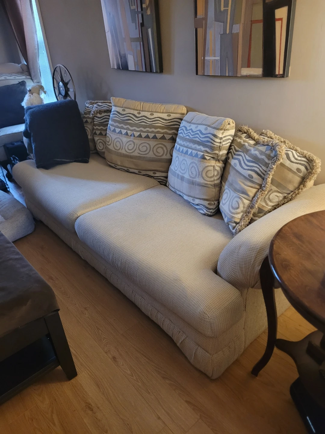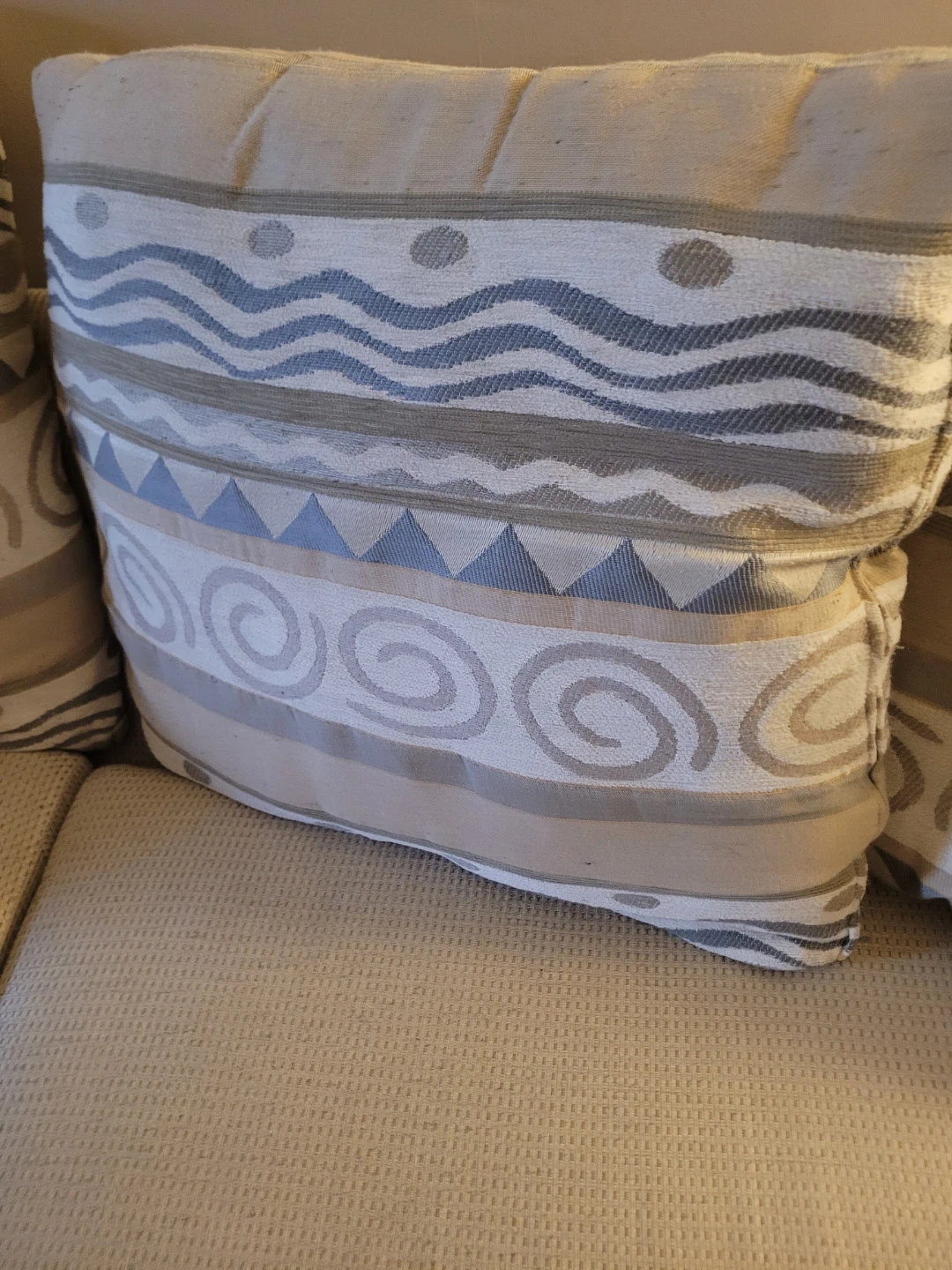 Cream sectional sofa featuring Upholstered in a textured fabric. Includes multiple decorative throw pillows with patterned covers.