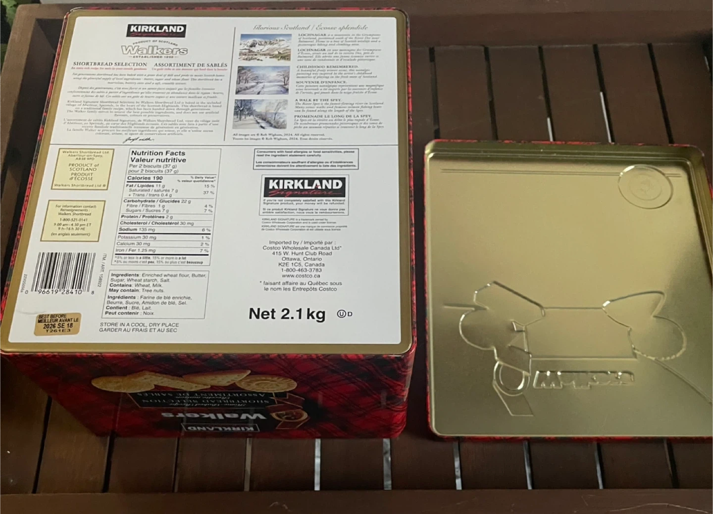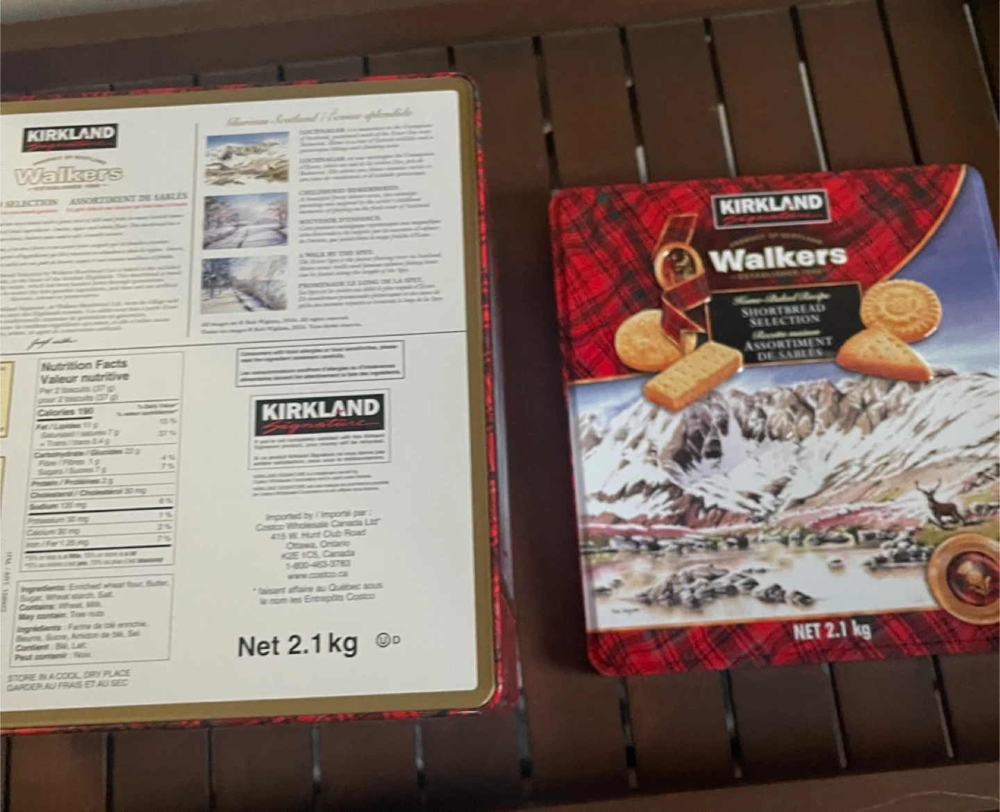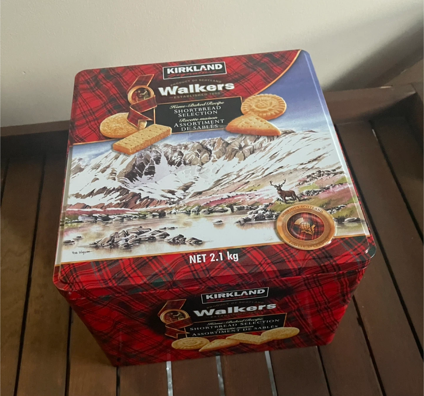 Only empty tin of Kirkland Signature Walkers Shortbread Selection in a decorative tin. Contains assorted shortbread cookies. Net weight is 2.1 kg.