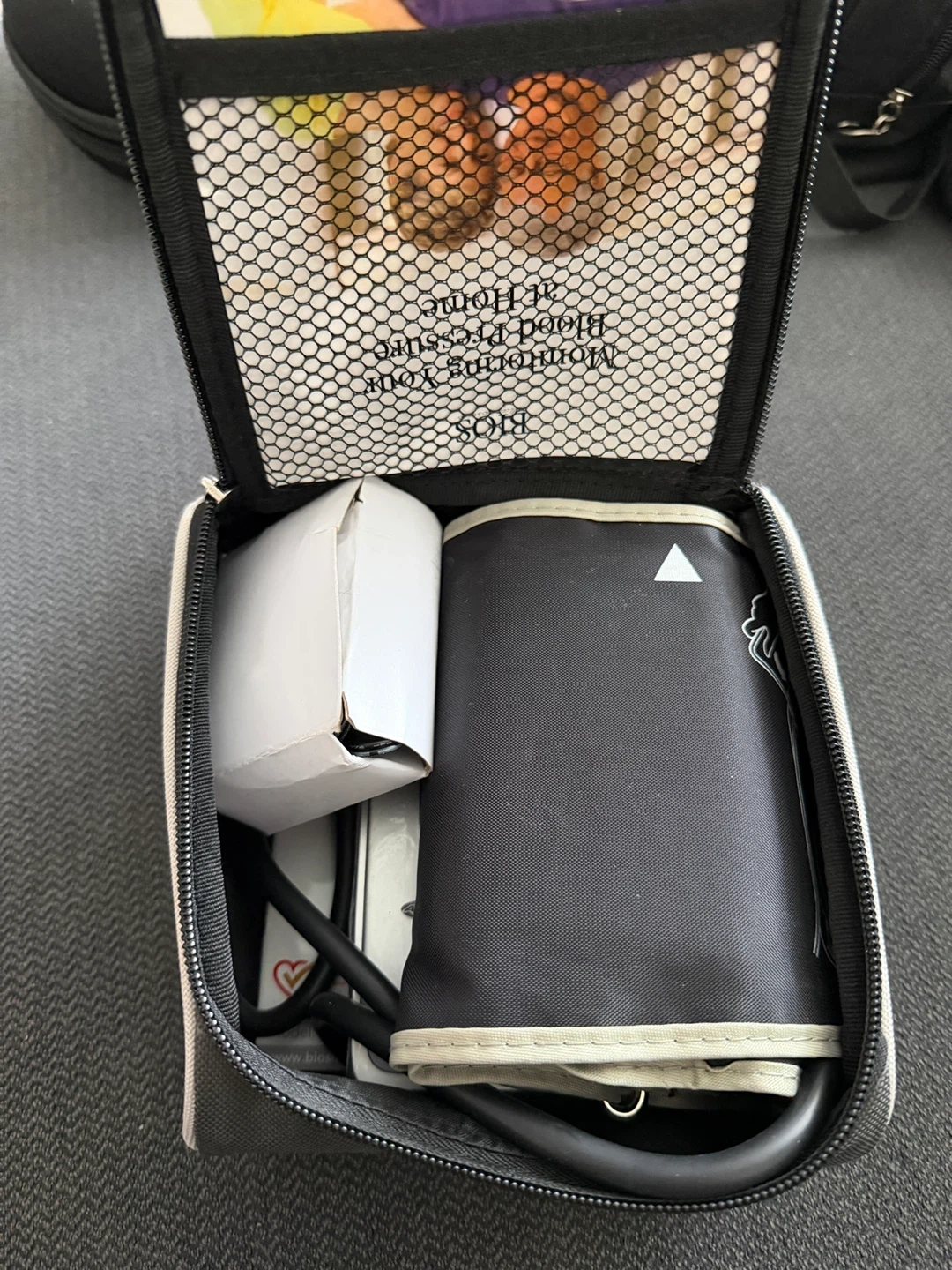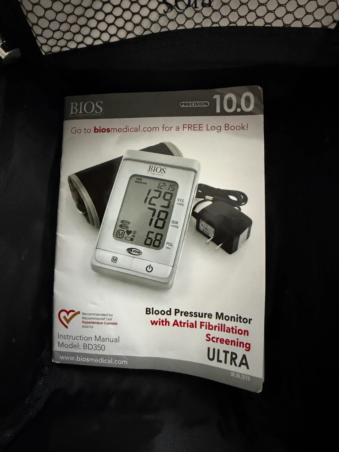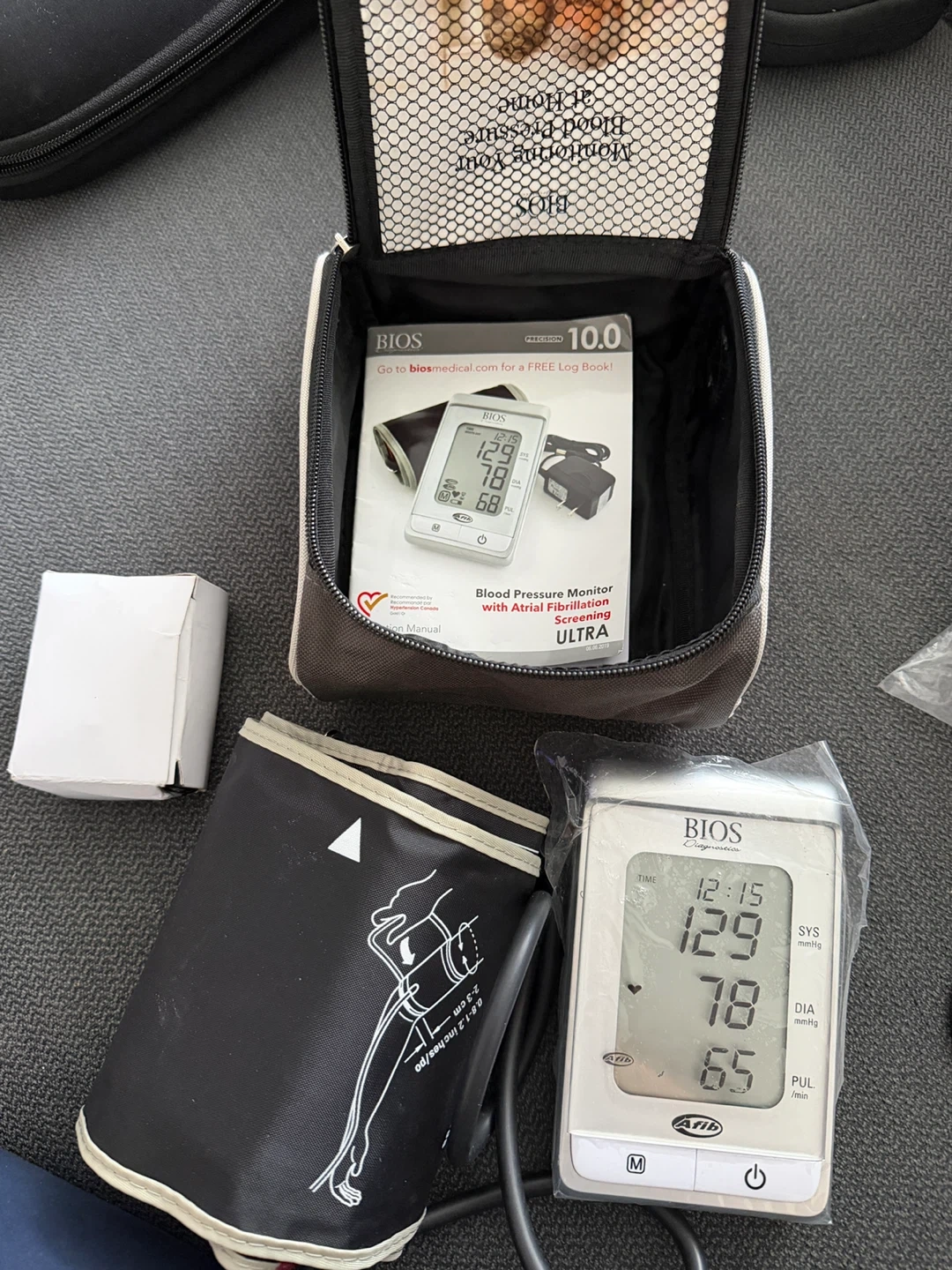 This BIOS Diagnostics Precision 10.0 blood pressure monitor comes with a cuff and power adapter. It has an AFib screening feature. The instruction manual is included. Monitor your blood pressure at home!