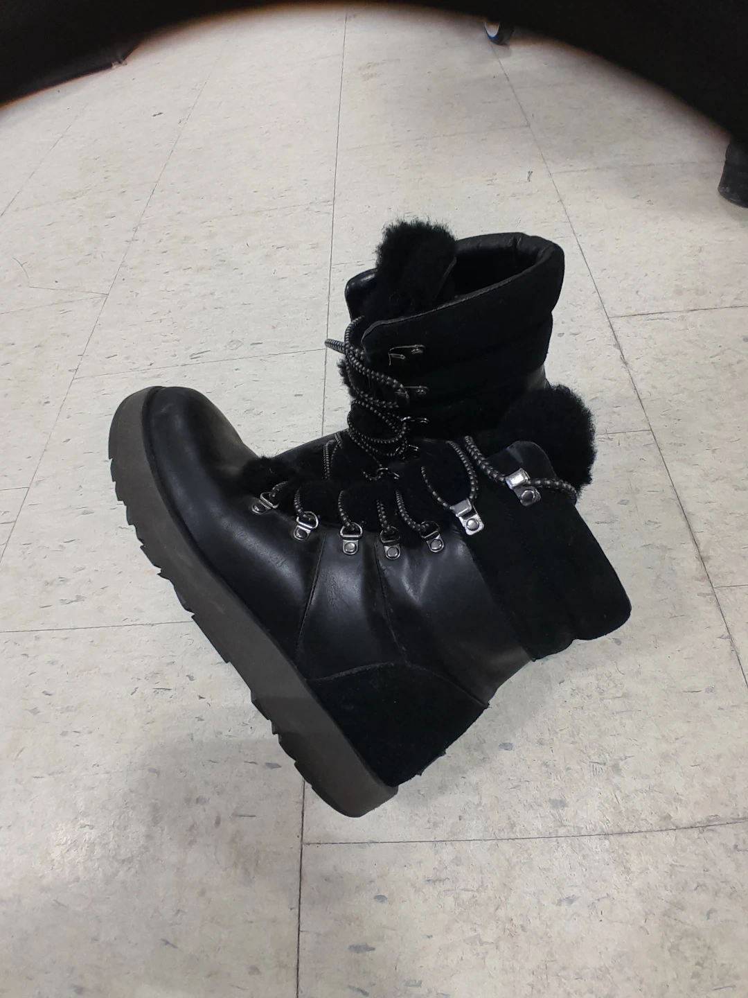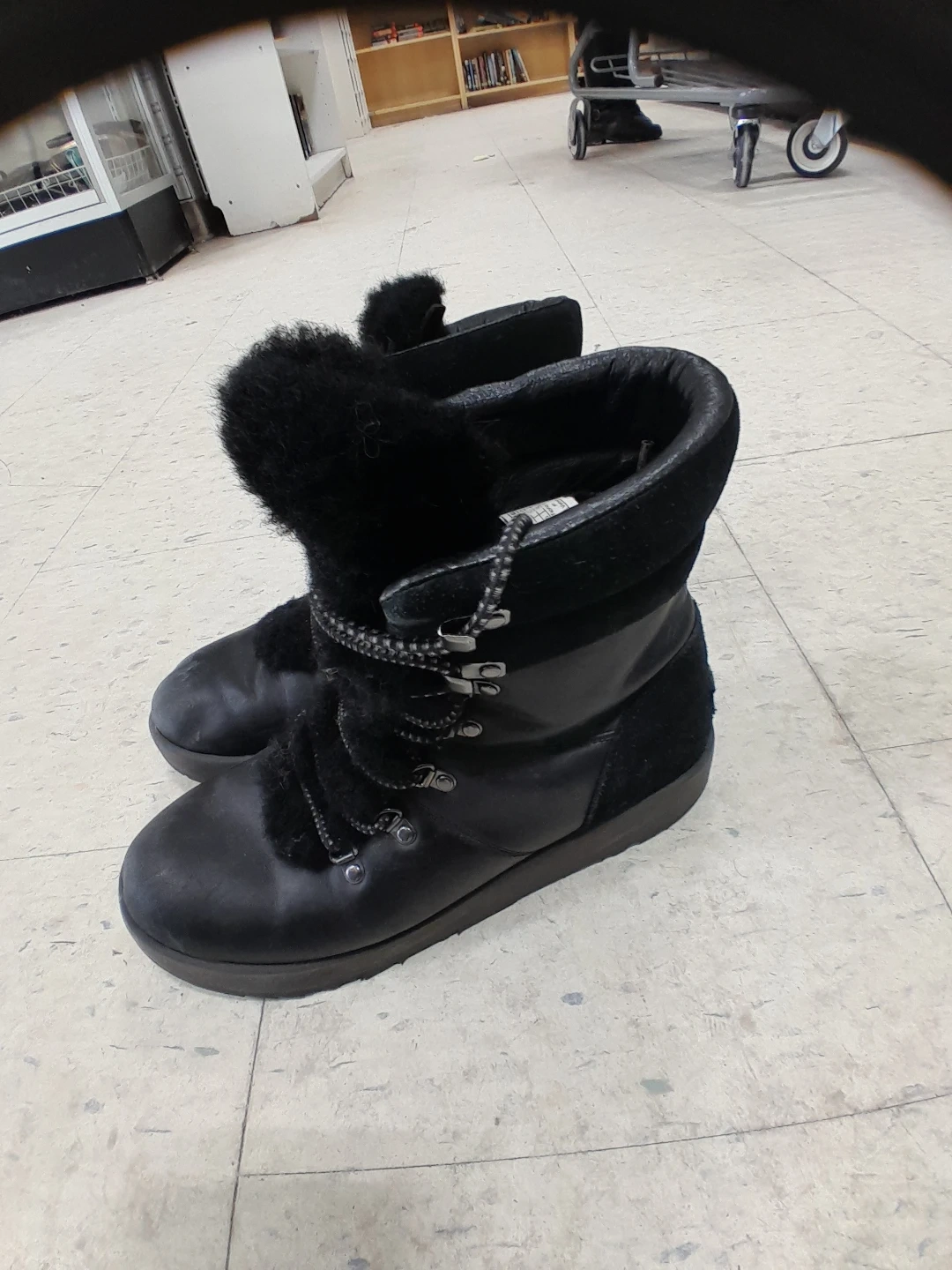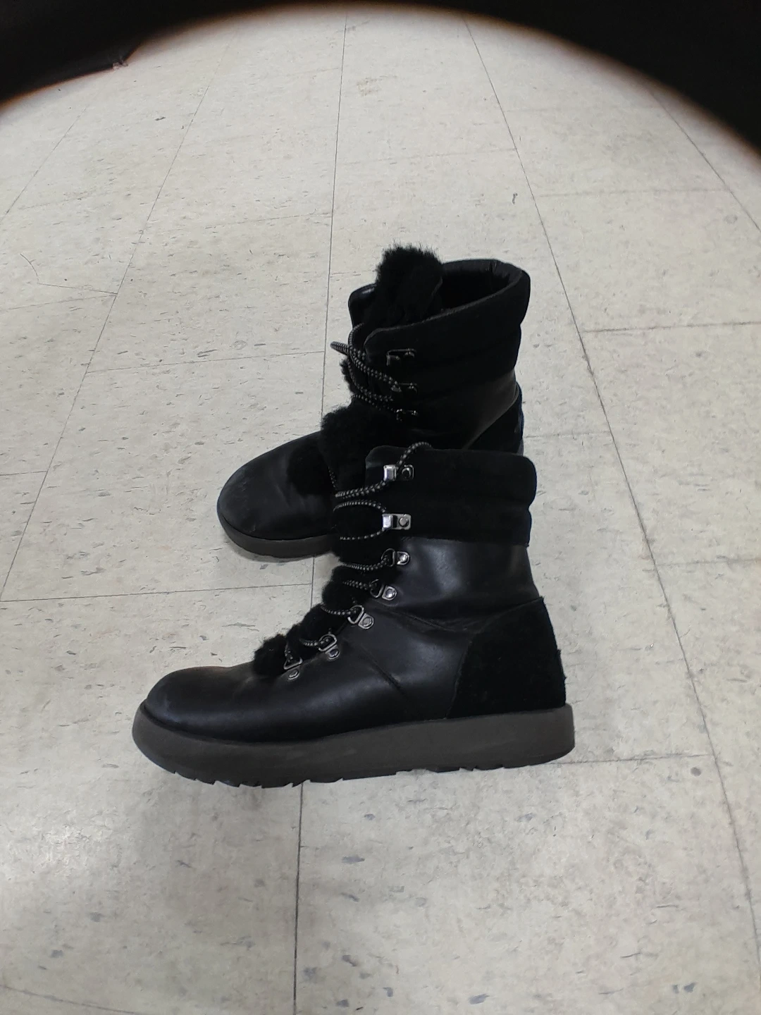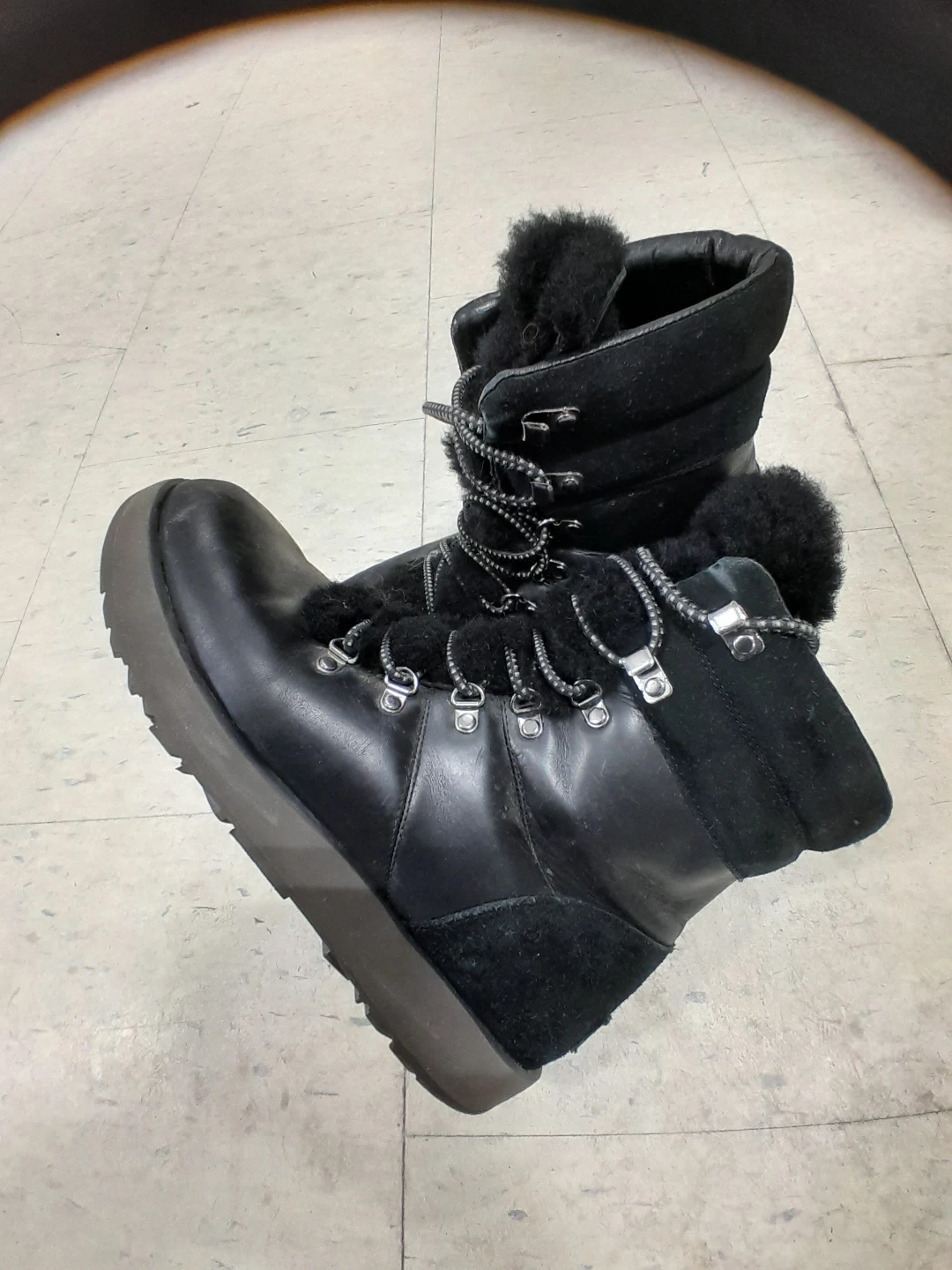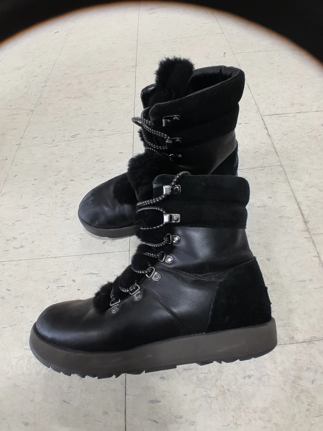 Black winter boots are designed for warmth and style. They feature a combination of leather and suede materials with soft fur trim around the collar. The lace-up front ensures a secure fit. Perfect for cold weather, they'll keep your feet cosy and protected original UGG Men's size 8