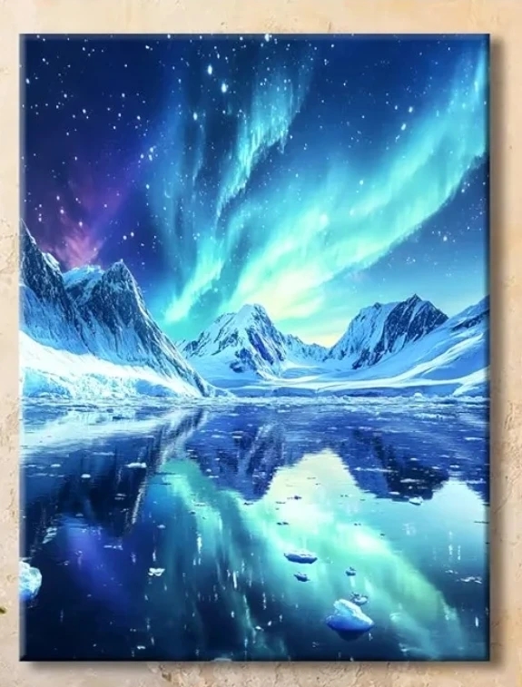 This canvas wall art depicts a stunning aurora borealis over snow-capped mountains and a frozen lake. It's ready to hang and would add a beautiful touch to any room. The vibrant colours and reflections create a serene, natural scene.