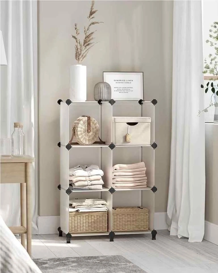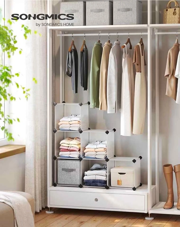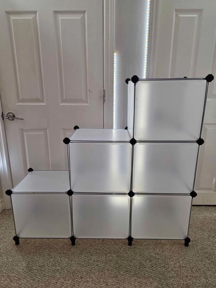 Brand new product from a liquidation pallet. Model: SONGMICS LPC206. Compact 6-cube modular design, can be assembled in a stepped or rectangular shape. Ideal for small spaces, shoe storage, or closet organization. Includes assembly mallet and feet connectors. Available in both Black and White. Dimensions: 37" L x 12.4" W x 38.3" H (in stepped shape). Cube size: 11.8" x 11.8". Let me know if you're interested!