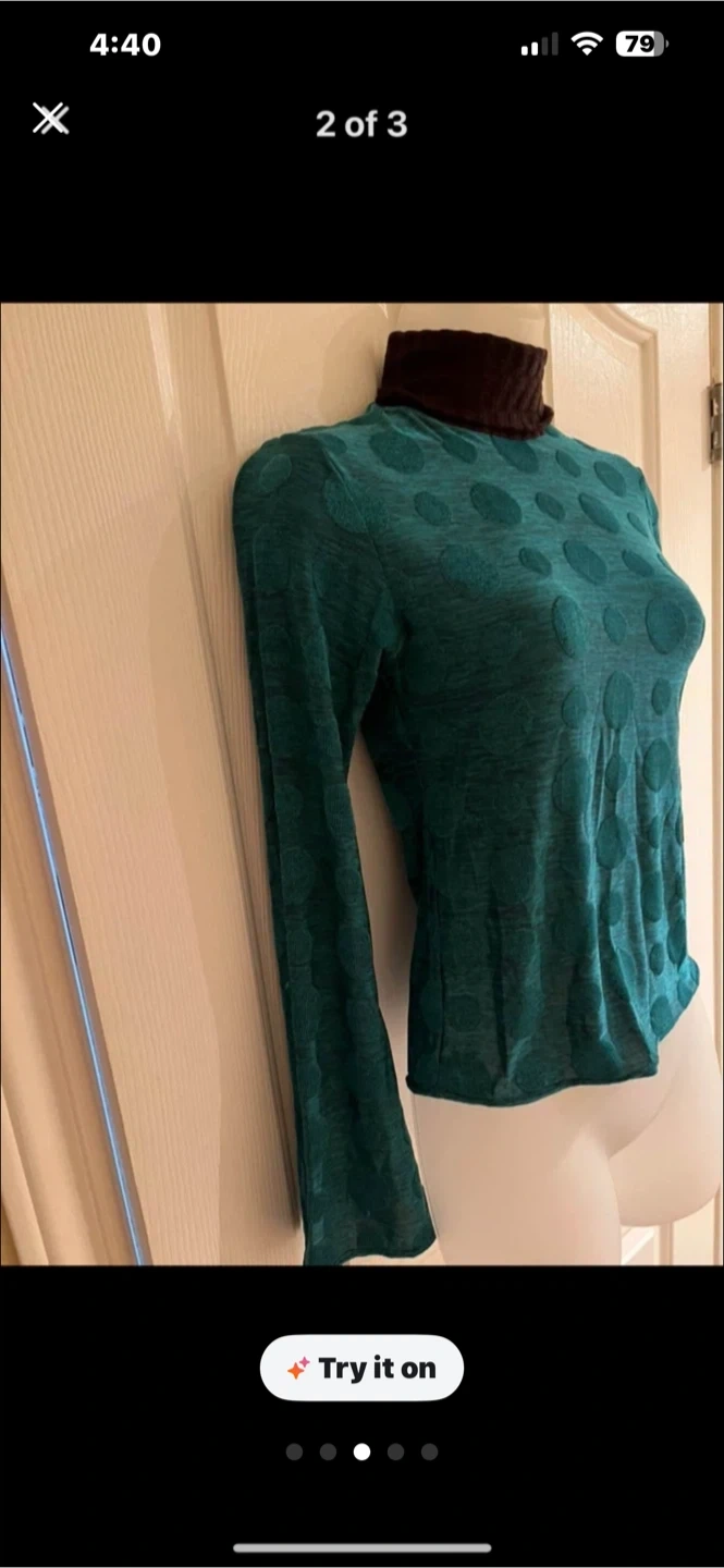 Teal long sleeve turtleneck shirt with a subtle polka dot pattern. It's made from a lightweight material. This top is great for layering or wearing on its own.