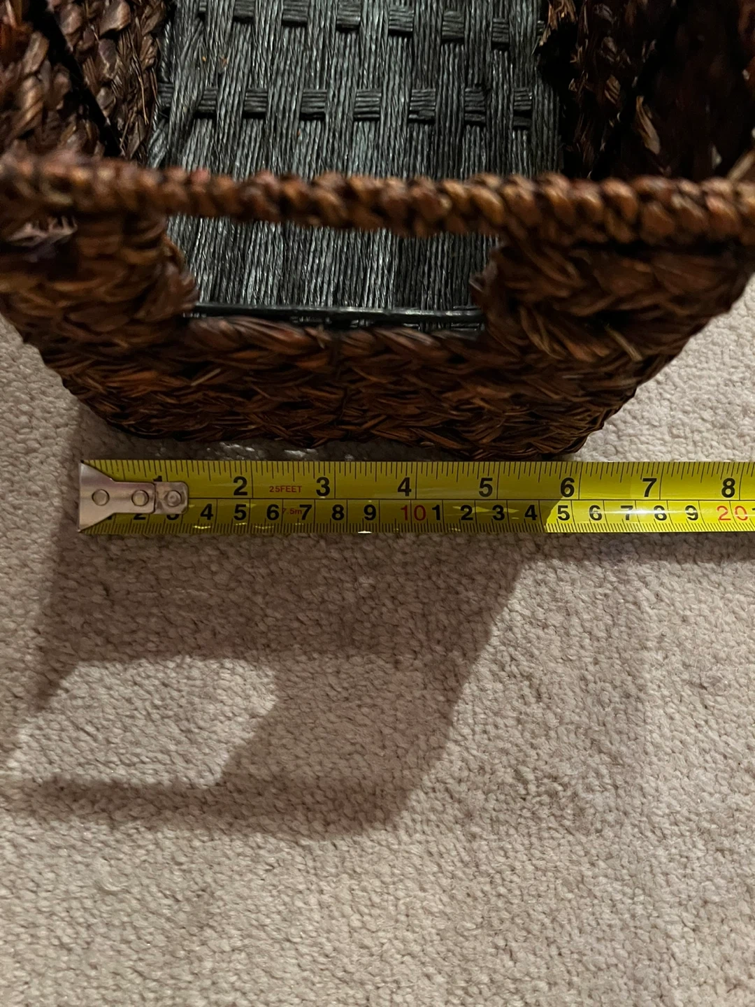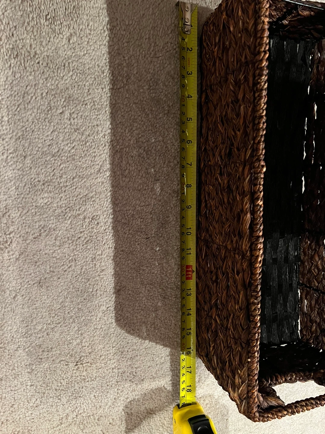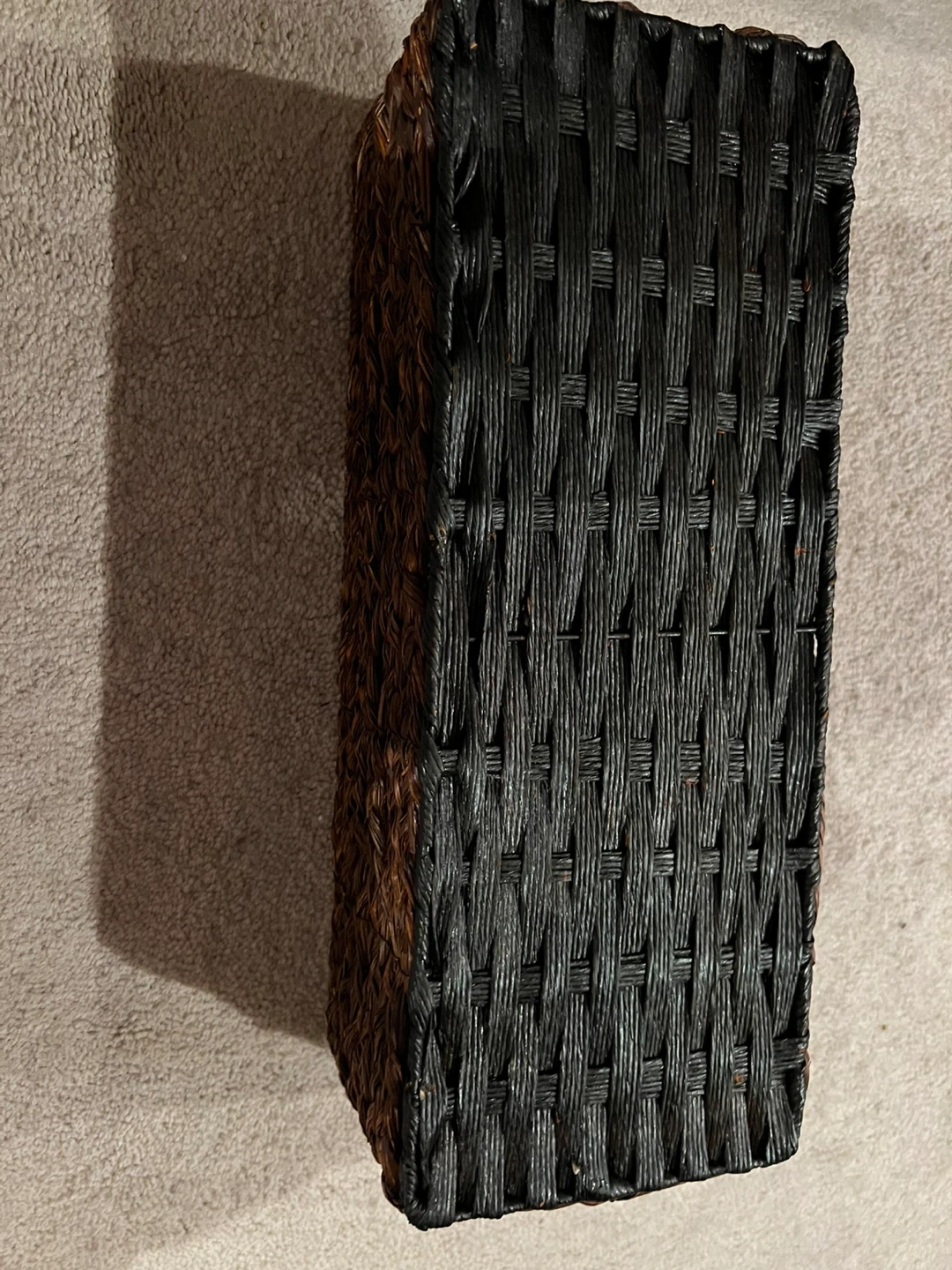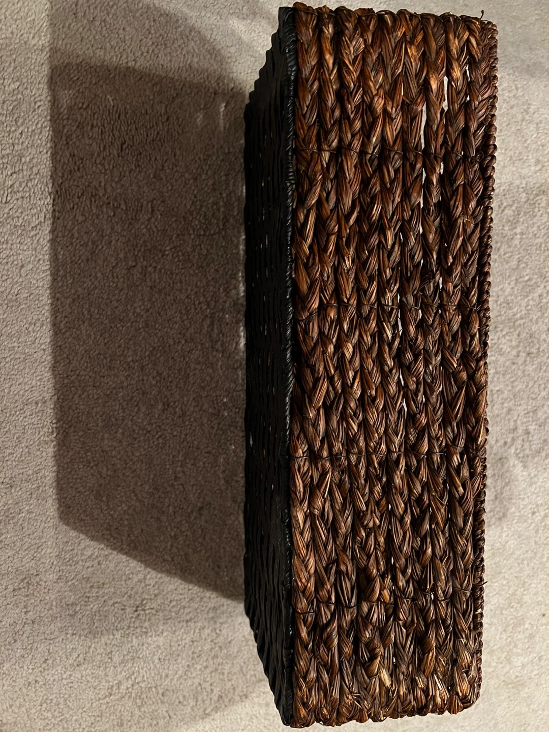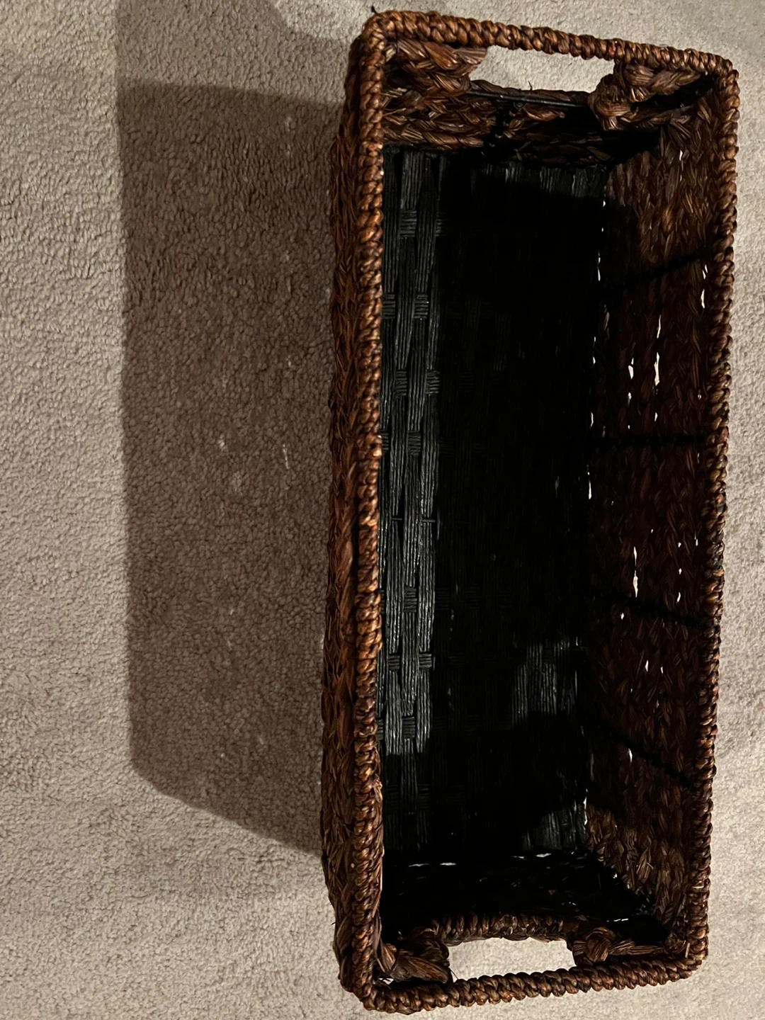 A rectangular woven storage basket, approximately 17 inches long and 6 inches wide. It features braided handles and a dark interior lining. This basket is great for organizing shelves or as a decorative piece.