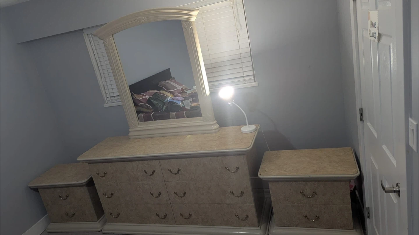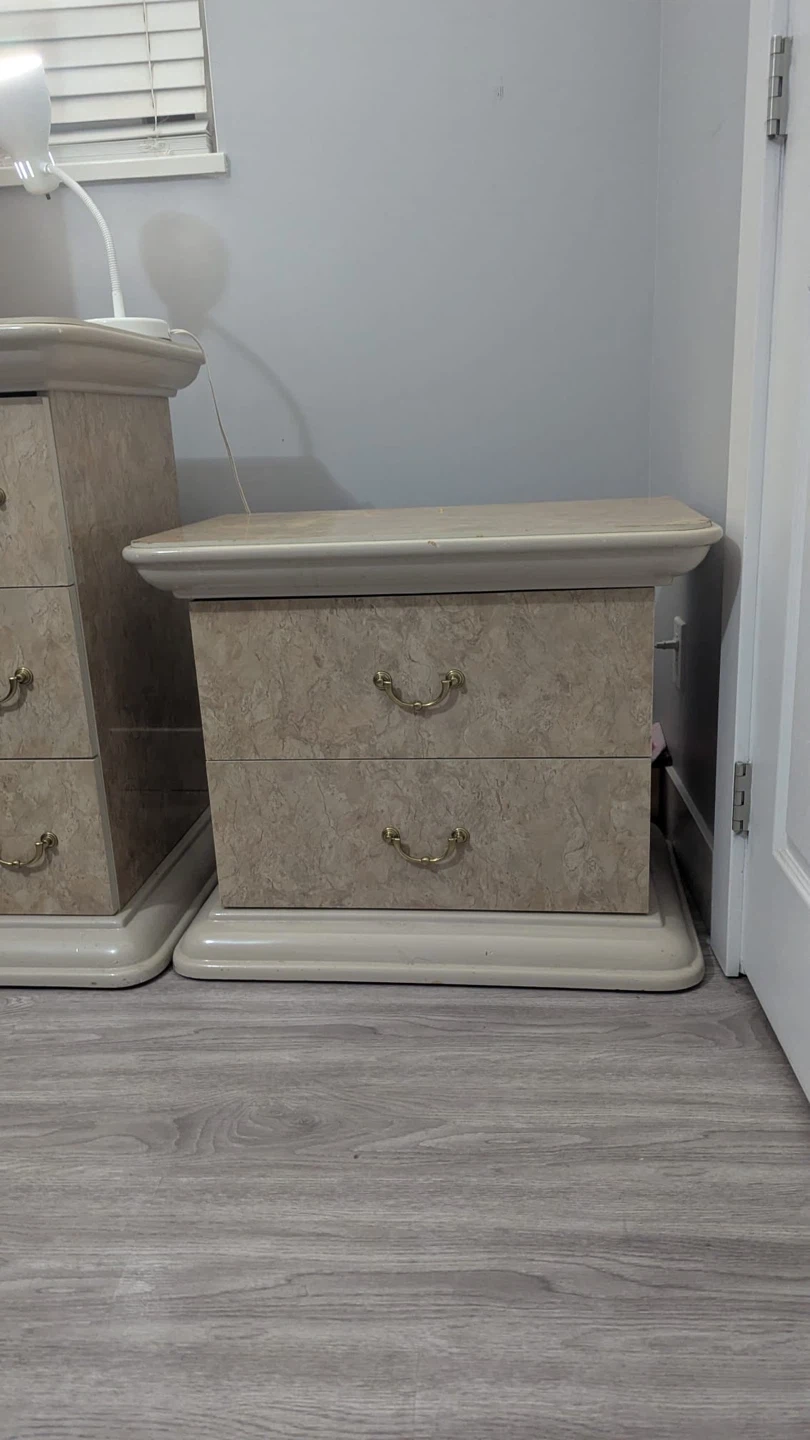 This nightstand features a faux marble finish and two drawers with brass-toned pulls. It has a sleek, modern design. It's perfect for storing bedside essentials.