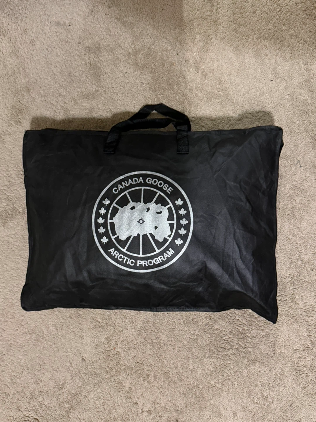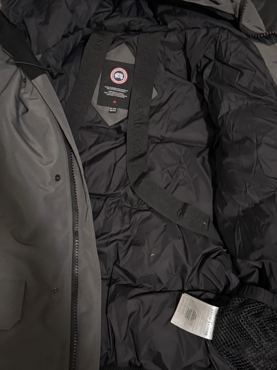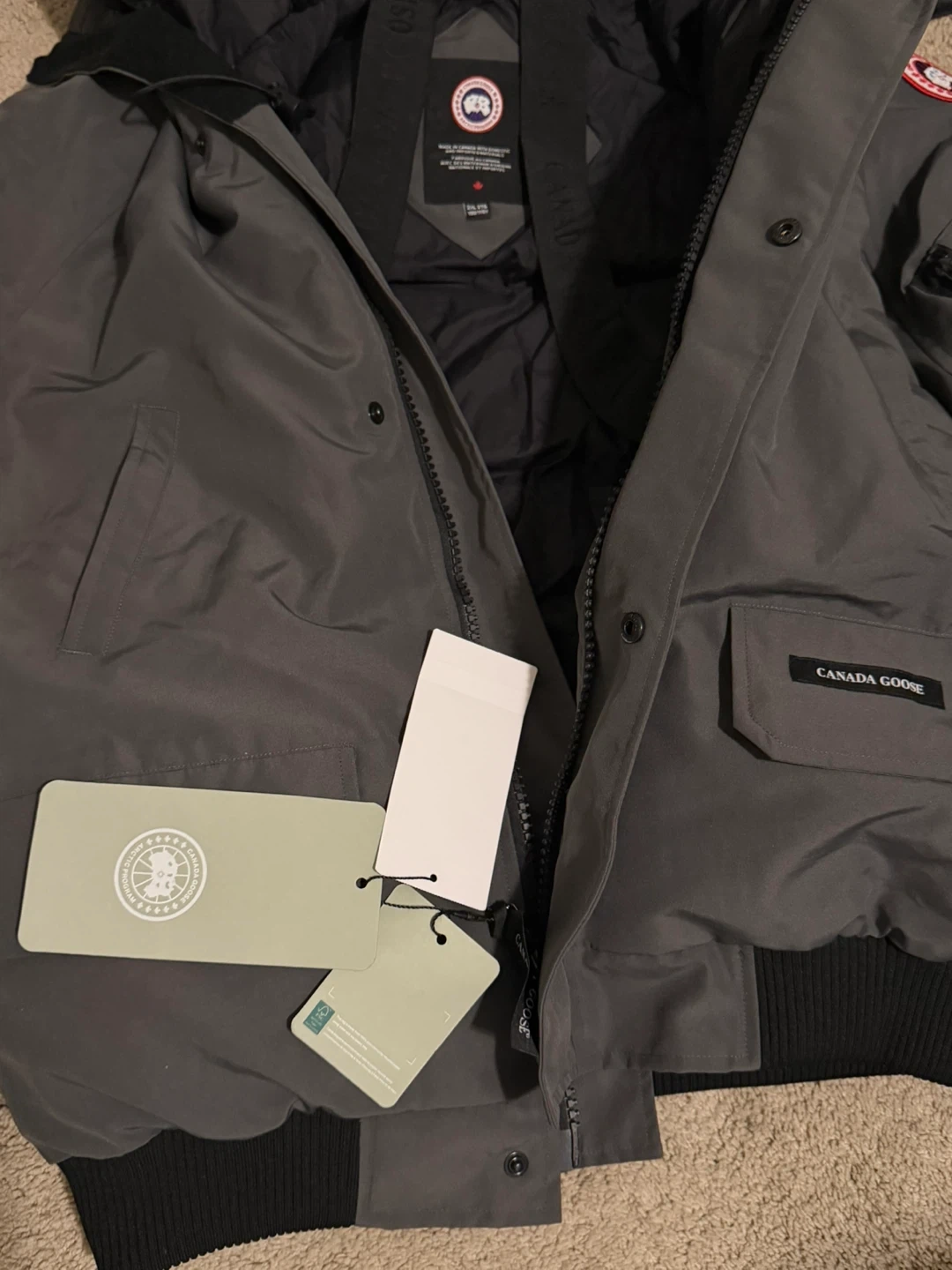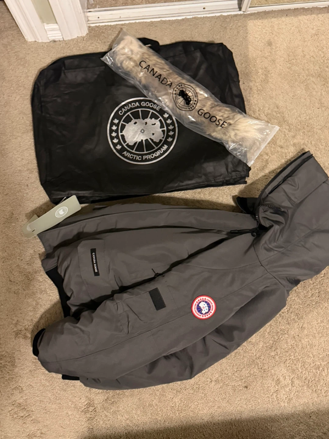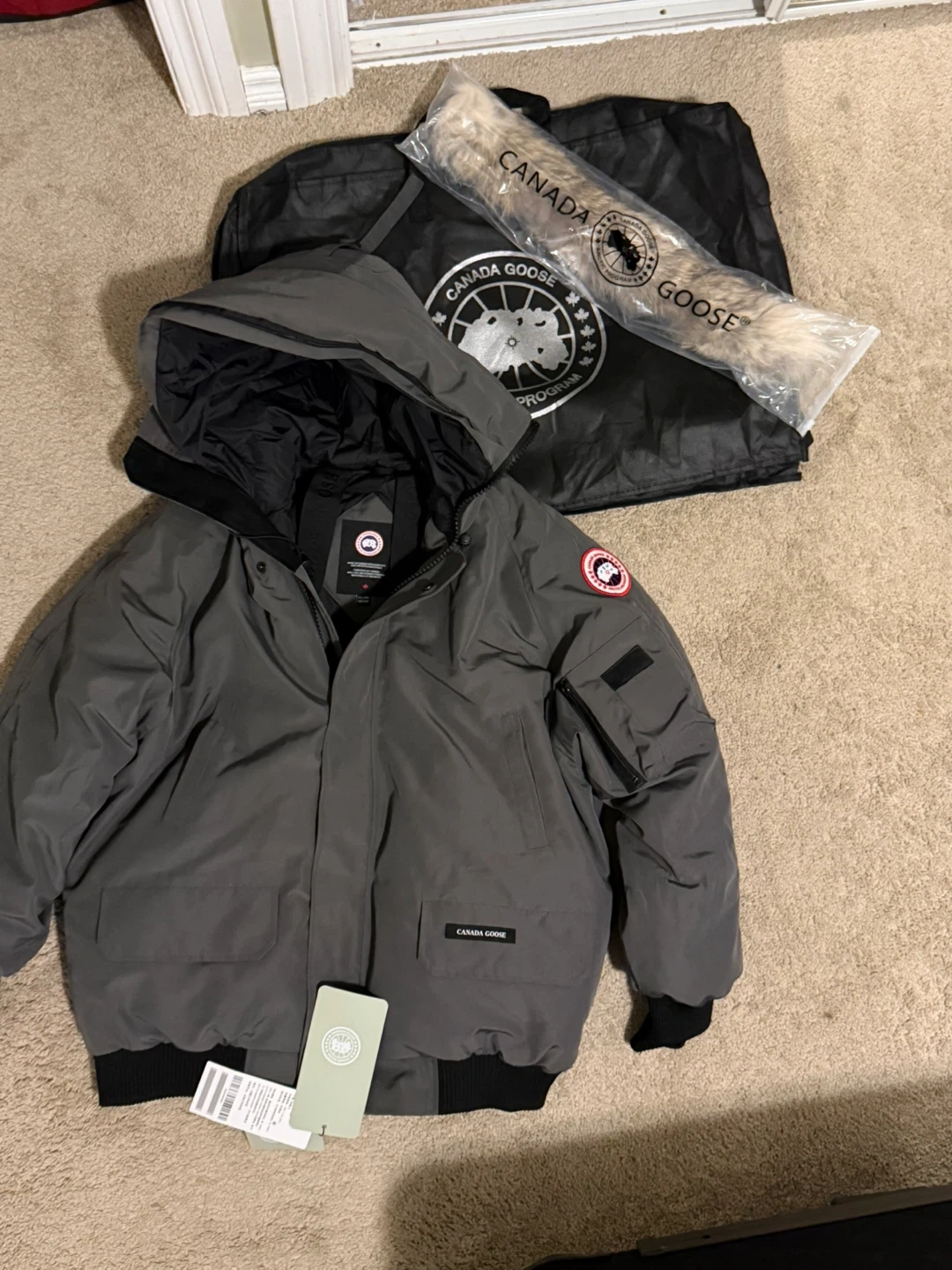 This is a Canada Goose bomber jacket in grey. It comes with its original Arctic Program bag and a detachable fur trim for the hood. Its interior features adjustable straps and has the signature Canada Goose branding throughout.