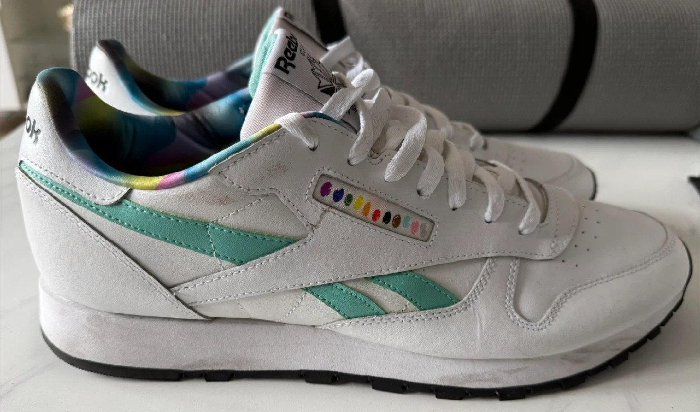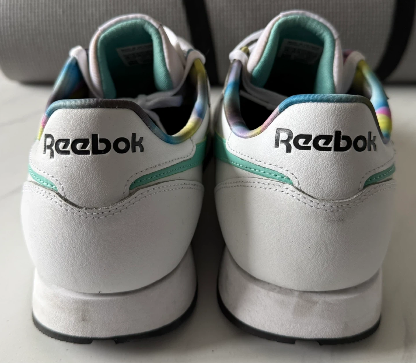 White leather Reebok Classic Leather sneakers with teal and multi-color accents. Features a tie-dye pattern on the inner lining. Size 14